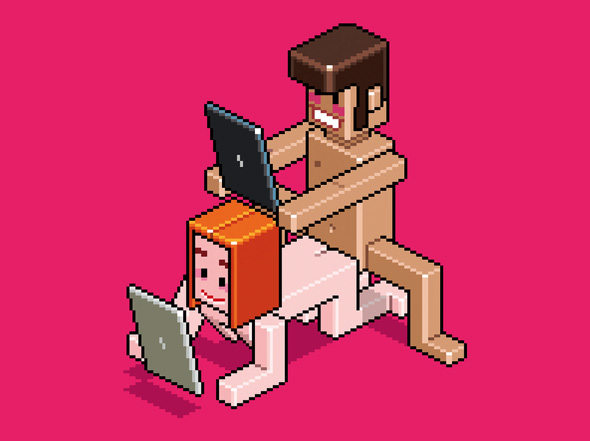 Anche secondo Totto Renna il mondo digitale è una distraente intrusione nel rapporto carnale, lo conferma questa sua illustrazione realizzata utilizzando coerentemente la tecnica della pixel art.