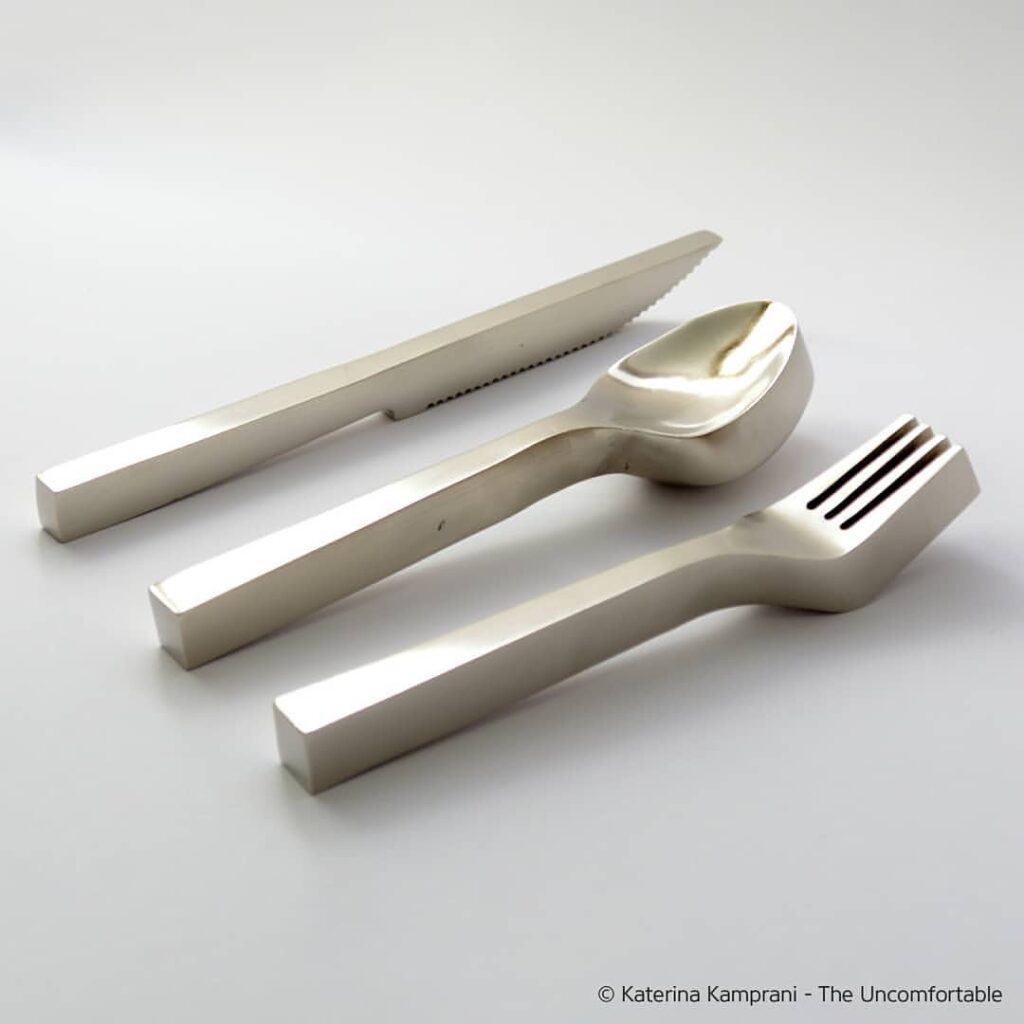 La serie di progetti intitolata “The Uncomfortable” include molti oggetti familiari rielaborati in modi che sfidano la loro funzionalità essenziale. Tra le creazioni più iconiche ci sono le sedie inutilizzabili, perchè con gambe di diversa lunghezza, le posate inspessite e i bicchieri deformati.