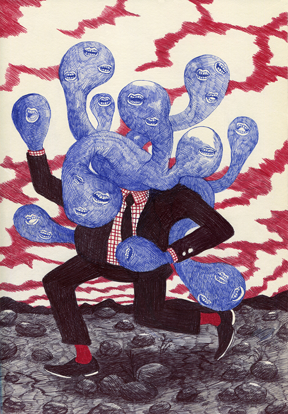 Ci sono mille mondi nascosti dietro alla realtà sensibile. L’illustrazione di Kevin Lucbert si inserisce nello spazio vuoto dell’immaginazione e prende forma cavalcando le linee essenziali di una biro, ricreando impossibilità fisiche, paesaggi da sogno, volti senza vita che scrutano l’osservatore. E così la curiosità si mescola ad uno strano stato d’animo che ha decisamente i connotati dell’inquietudine. Siamo pronti a scommettere che i suoi disegni non vi lasceranno indifferenti.