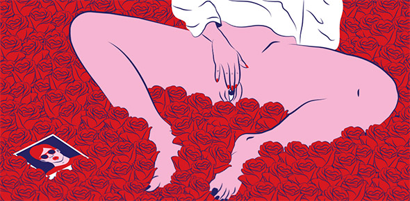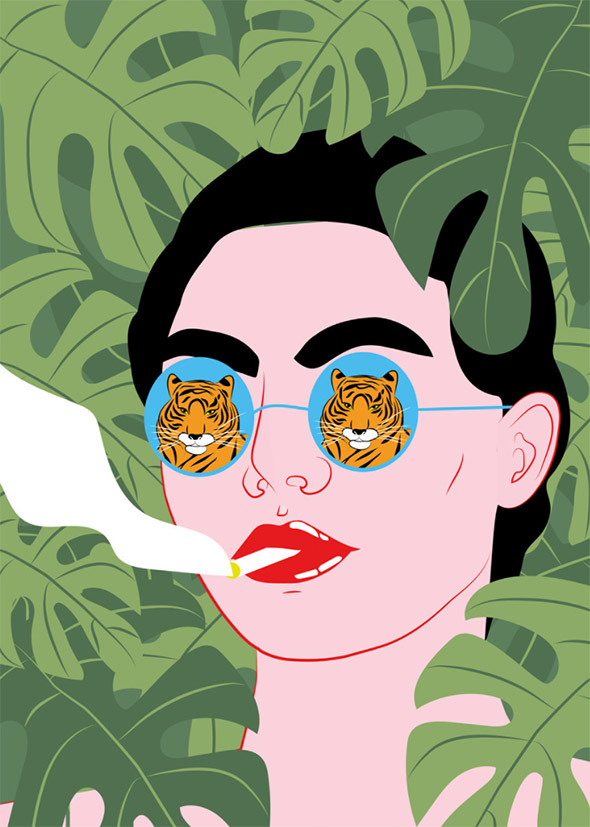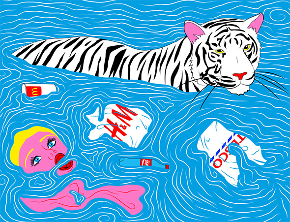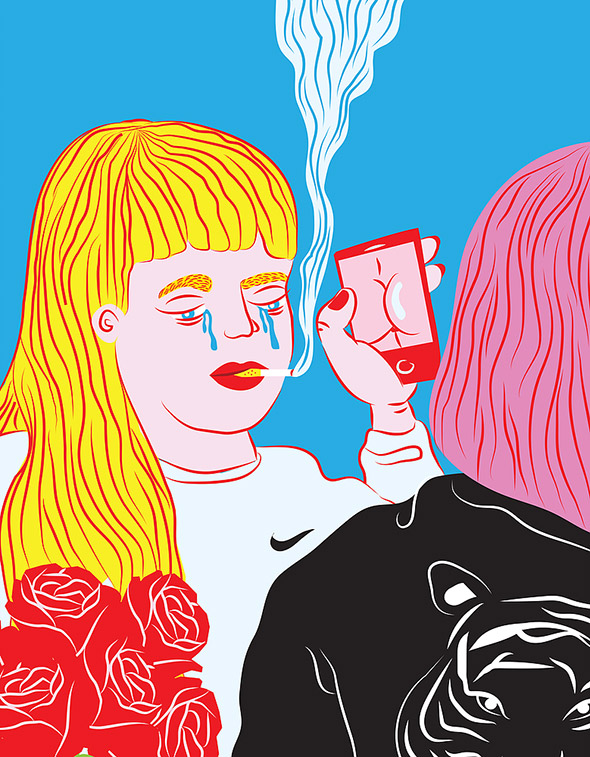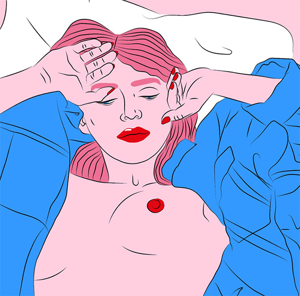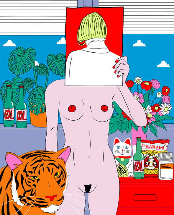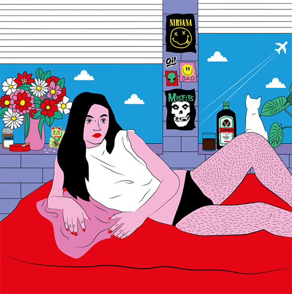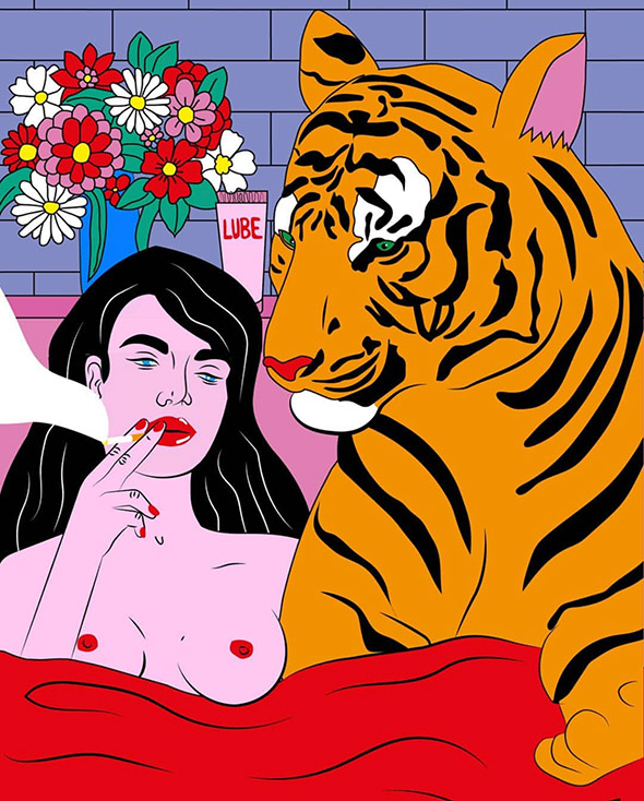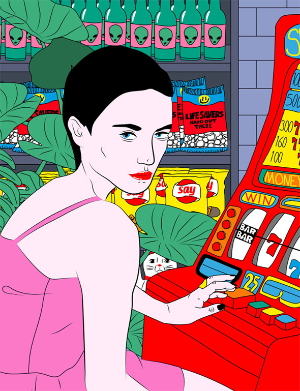 Le sue illustrazioni sembrano uscite direttamente dai romanzi di Charles Bukowski, e stride il contrasto tra la crudezza del tratto e la vivacità dei colori, che ricordano la pop art di Roy Lichtenstein. A differenza di quest’ultimo però Kine è nata e cresciuta negli anni ’90 in un piccolo paese della Norvegia, coltivando dentro di sè tutta la frustrazione di un adolescenza relegata nella solitudine e nell’oblio.