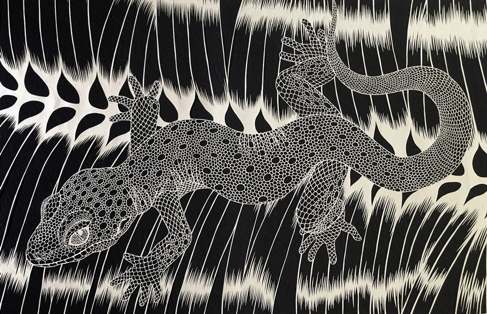 Masayo Fukuda disegna i soggetti delle sue opere direttamente sul retro di un unico foglio di washi, una carta giapponese fatta a mano secondo il metodo tradizionale millenario che dal 2014 è diventato Patrimonio immateriale dell’umanità dell’UNESCO. Kiri-e è il nome giapponese di questa antica forma d’arte di origini cinesi che risale a 1400 anni fa. Masayo la pratica da circa 30 anni.