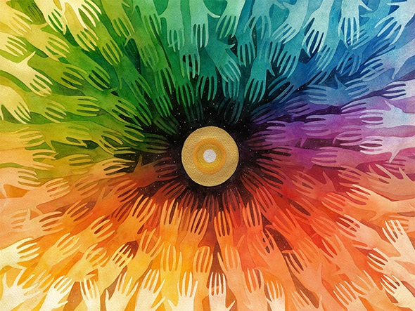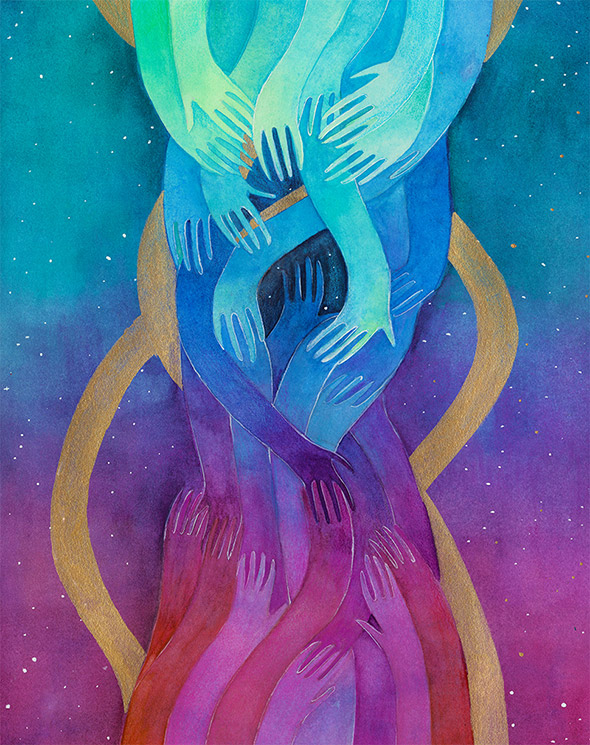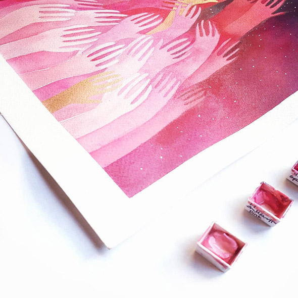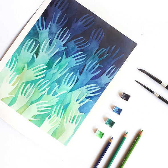 Artista messicana autodidatta, cresciuta in comunione con l’arte e la natura e ora circondata dal mare dei Caraibi, Ana Sofia riesce a creare immagini potenti che dialogano con chi sia capace di ascoltare, grazie ad uno stile basato sulla ripetizione di pochi semplici elementi. Le mani, su tutti, simbolo della natura umana, si cercano, amano, stringono e aspirano a qualcosa di alto: salvezza, felicità o forse all’essenza stessa della vita.