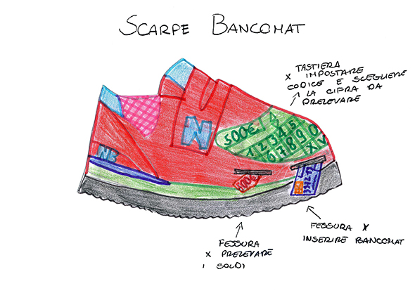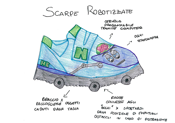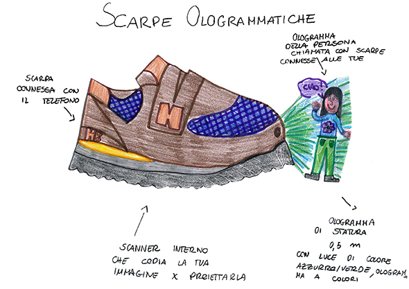 Grazie a Giulia, abbiamo scoperto gli incredibili viaggi che può compiere la creatività di una giovane di 10 anni nel disegnare e progettare uno strumento essenziale dell’abbigliamento quotidiano: le sneakers. Scarpe volanti, scarpe con il bancomat incorporato, scarpe in grado di riportarci a casa o di proiettare l’ologramma della persona a cui stiamo telefonando. Per scoprire le altre fantasmagoriche invenzioni di Giulia visitate questa pagina.
