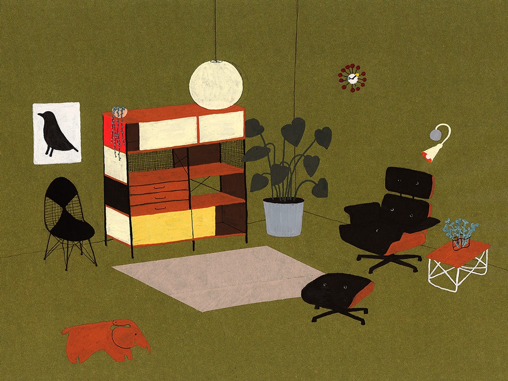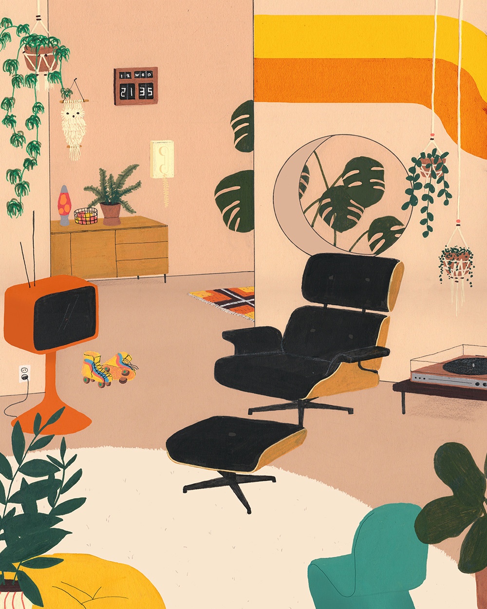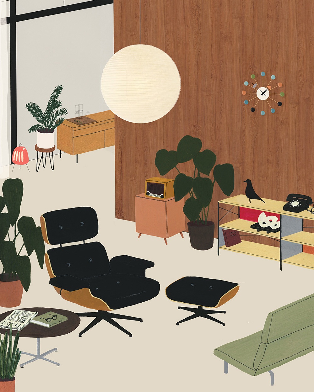 In questa ambientazione si può riconoscere la classica lounge chair col pouf, chiamato anche ottomana, progettate da Charles e Ray Eames nel 1956. Nelle quattro immagini seguenti Lianne ha immaginato di farle dialogare con gli stili di arredo dagli anni ’50 ad oggi.