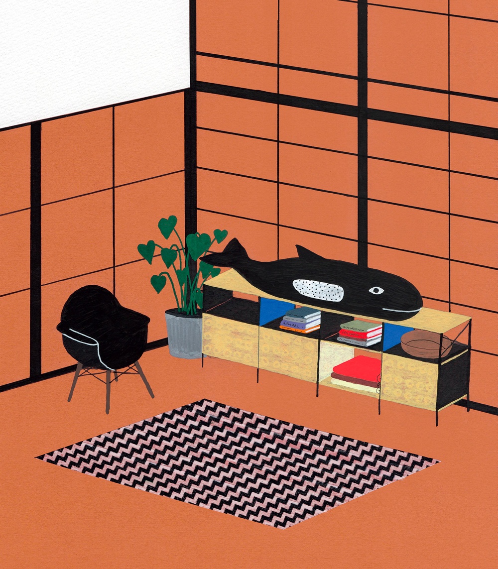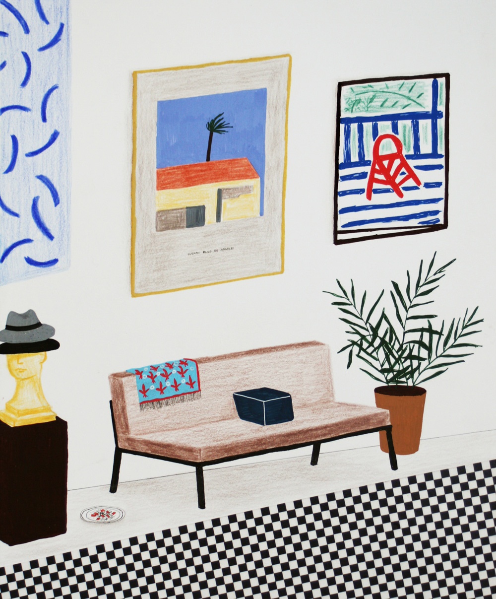 Realizzati a mano con matite e pennarelli acrilici su carta colorata, i lavori di Lianne Nixon risultano essenziali e quasi metafisici. Gli spazi sono assonometrici e gli oggetti raffigurati non hanno ombre, il che crea un effetto di appiattimento che ricorda i dipinti medievali. C’è un solo, grande assente: l’uomo. Come in un dramma teatrale di oggetti, sedie e arredi recitano la loro parte di presenze viventi, aspettando che arrivi Godot.