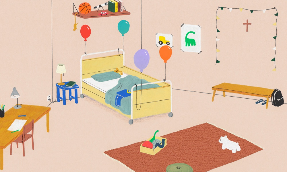 Illustrazione per The Guardian che accompagna un articolo dedicato alla vicenda di un bambino disabile cognitivo e fisico che vince in premio la possibilità di arredare la sua nuova camera da letto. Lianne immagina come potrebbe essere.