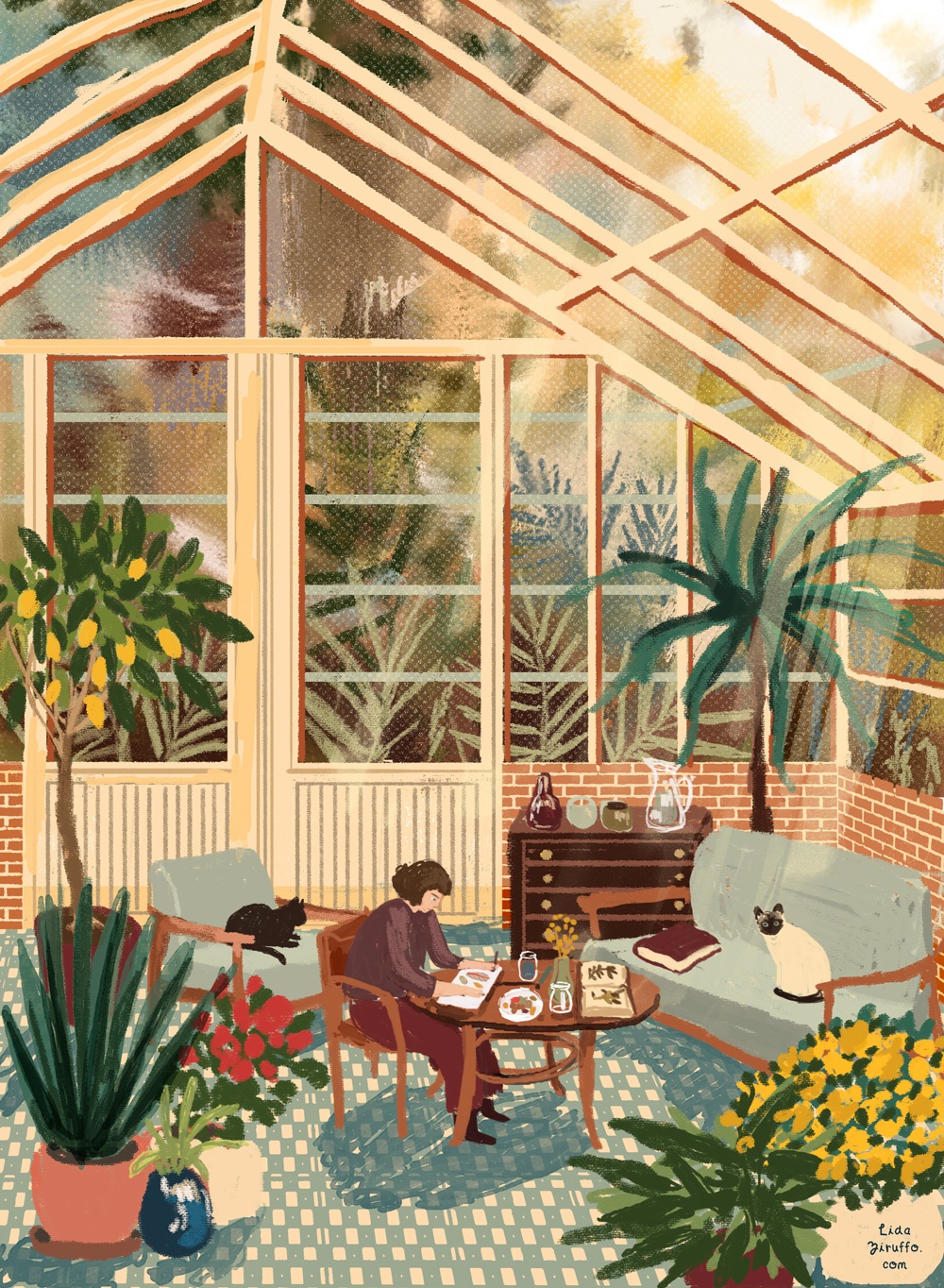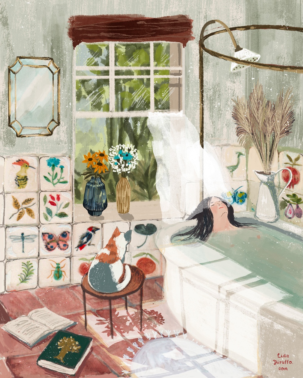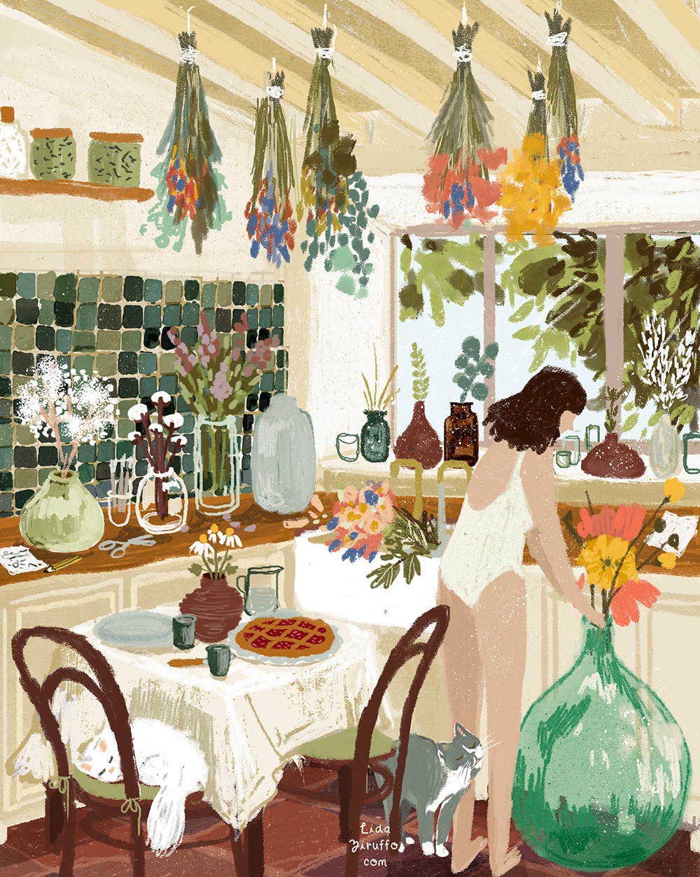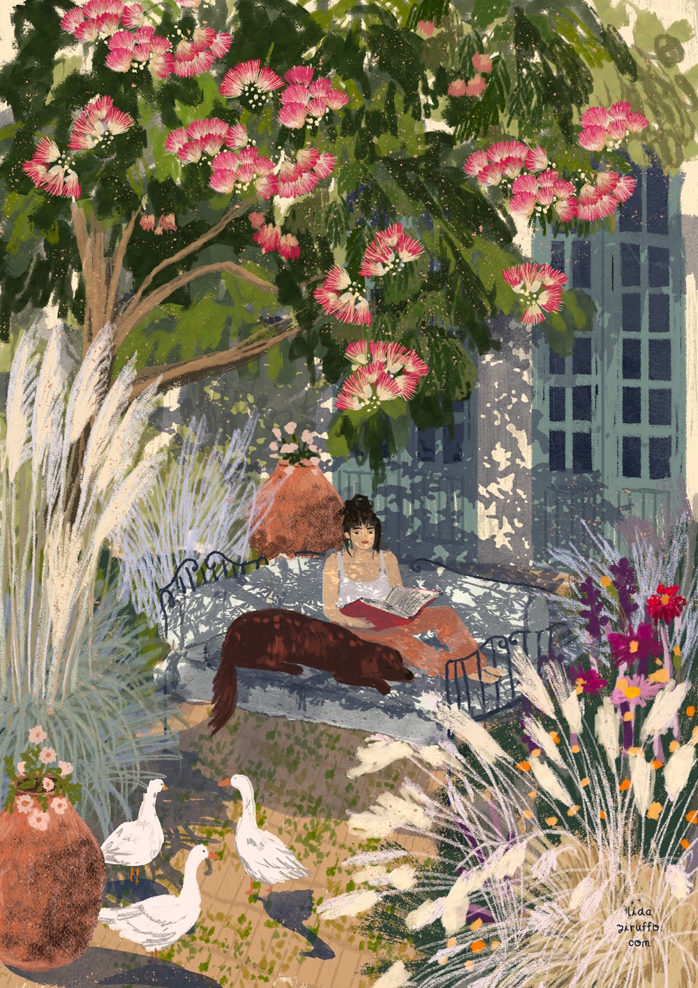 Le tavole sono una terapia verde, un invito a entrare per respirare a pieni polmoni e perderci nelle forme dal tocco impressionista che sembrano vibrare nell’aria. Per realizzarle, Lida utilizza sia tecniche digitali che tradizionali come l’acquerello, i pastelli a olio e la china. I lavori che ha realizzato per l’editoria sono comparsi soprattutto su riviste inglesi come Elle Decoration UK, ma ha lavorato anche per case editrici italiane di narrativa infantile e per eventi e progetti indipendenti. Lo scorso novembre ha preso parte al progetto Il tempo sospeso di Viterbo con un’illustrazione che sottolinea l’importanza di ristabilire un equilibro tra l’uomo e l’ambiente. Conosciamola meglio in questa breve intervista.