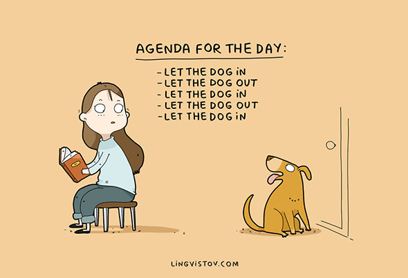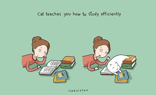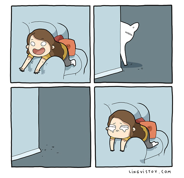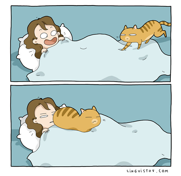 Il loro motto è “make people laugh!” e la dice lunga sulla filosofia creativa di Ligvistov, progetto nato nel 2012 dalla comunione di idee di Asia, Landysh e del gatto Augustus, inesauribile fonte di ispirazione per disegni e storie in cui tutti i possessori di gatti possono identificarsi. Un mondo che non si limita solo agli animali domestici ma coinvolge anche le situazioni di ogni giorno e tutti i temi più popolari sui social media: pizza, caffè, relazioni sentimentali, e così via. Su Boredpanda, dove i Lingstov pubblicano periodicamente illustrazioni e divertenti serie di vignette, leggiamo: