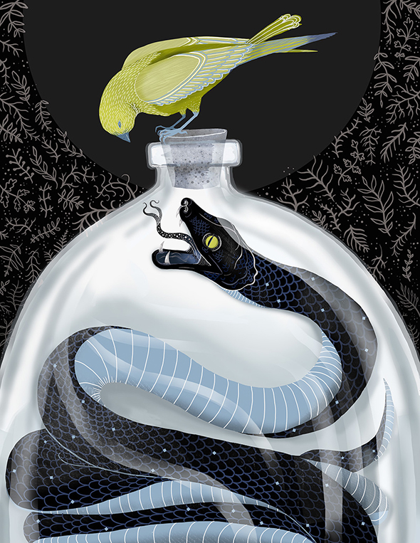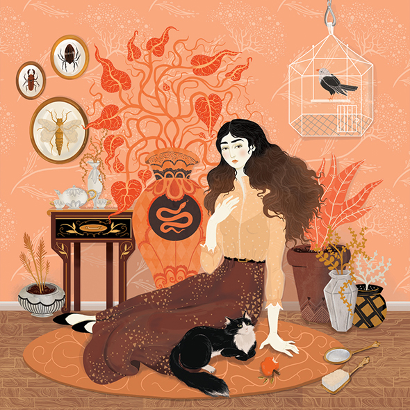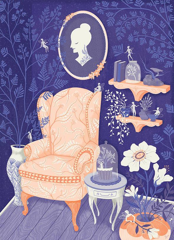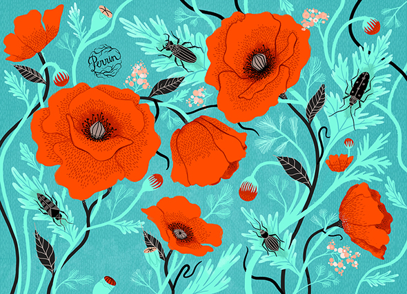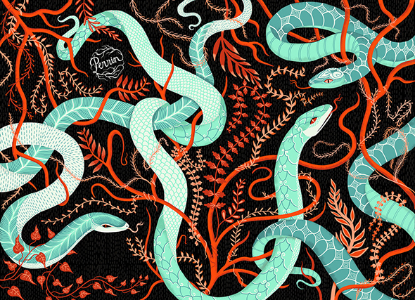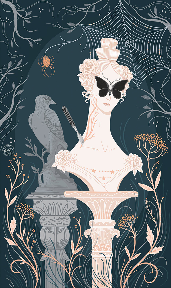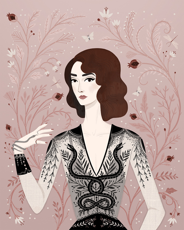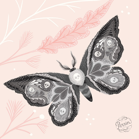 Nella sezione del sito dedicata alla propria biografia, l’illustratrice e letterer americana Lisa Perrin dice che il proprio lavoro “esplora il vecchio mondo in modo nuovo, combinando l’umorismo con l’oscurità, e la bellezza con l’eccentricità” ed è difficile trovarne una descrizione più pertinente. L’ispirazione ottocentesca viene espressa in forma vettoriale, ad animare antichi giardini in cui, tra i fiori sapientemente stilizzati, avvengono misfatti, eleganti ladies vittoriane e tatuate ricamano al tombolo, sinistri insetti, troppo chic per risultare veramente mortiferi, salutano da modernissime ricette di cucina.