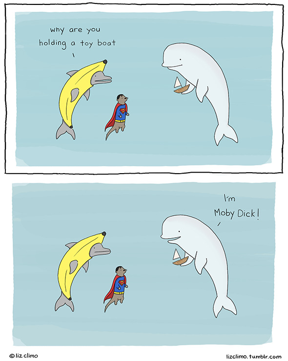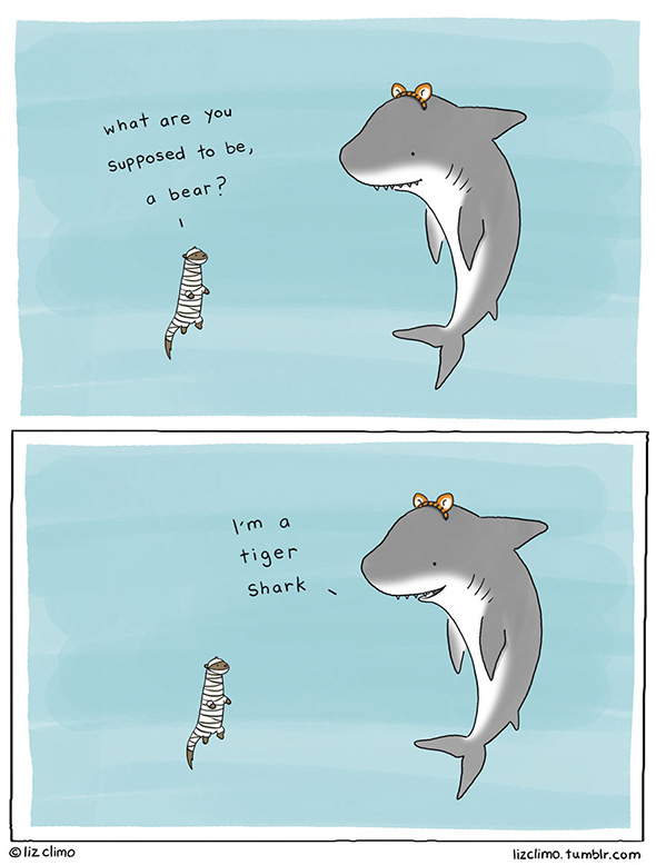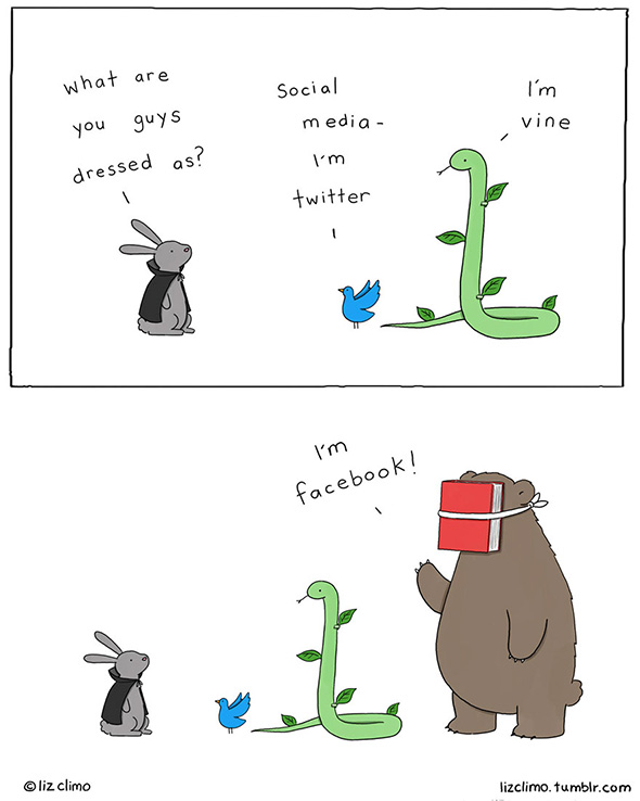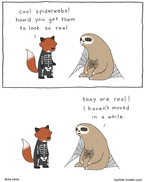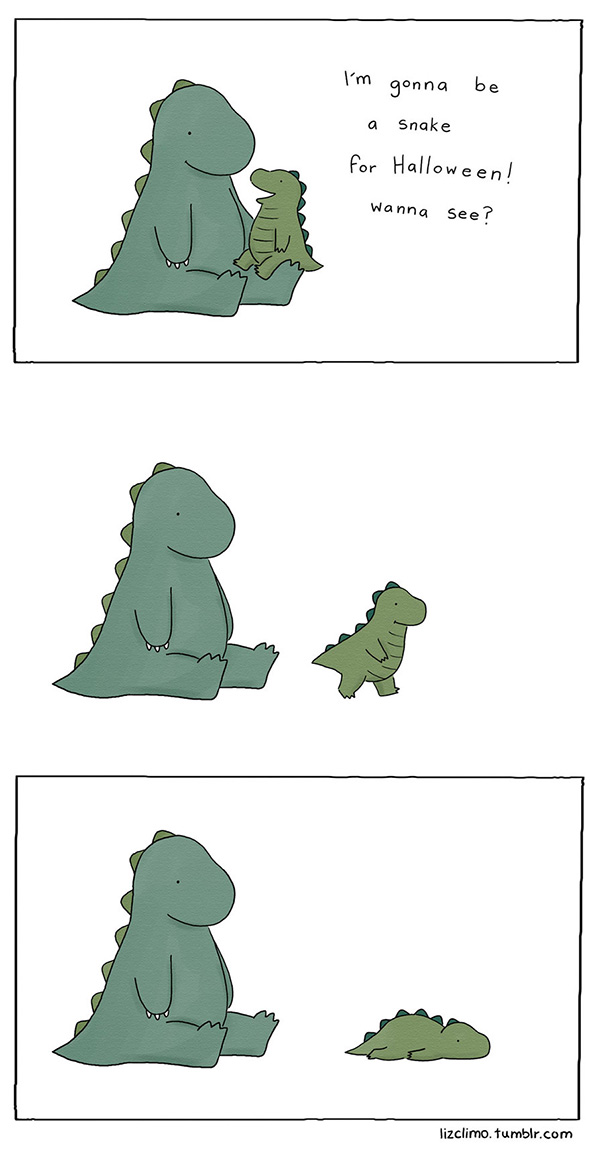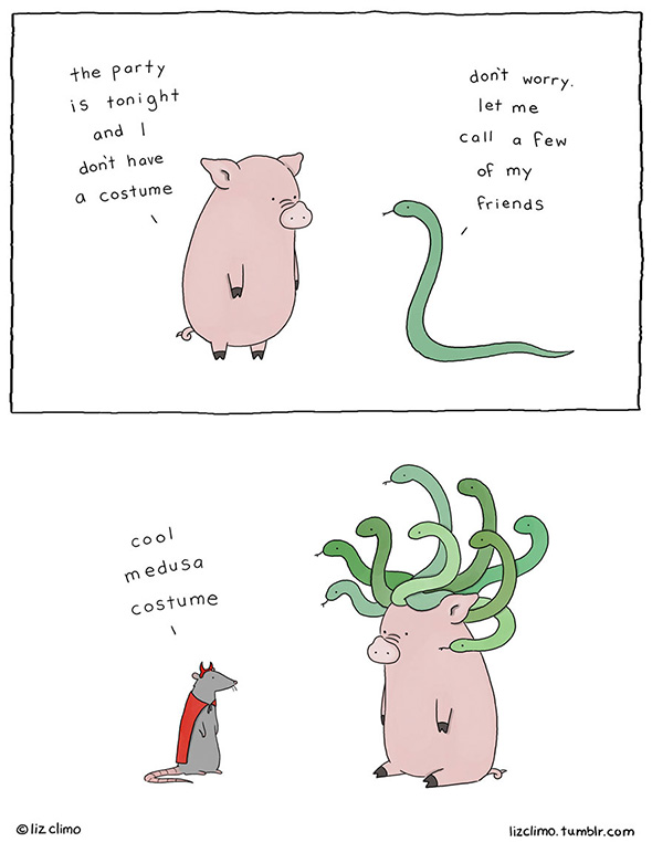 Nati come hobby serale sul suo blog, hanno incontrato un successo di pubblico sempre crescente, al punto da diventare un veroe proprio progetto personale parallelo, con tanto di realizzazione di libri per bambini e cartoline a tema. Lo stile è minimal e pulito, i dialoghi semplicemente adorabili. In questa gallery i nostri protagonisti sono alle prese con uno dei problemi più complicati di sempre: la festa di Halloween. Dalla preparazione delle zucche, alla passeggiata porta a porta in cerca di dolcetti, alla scelta del costume più appropriato, non c’è dettaglio che i personaggi di Liz Climo lascino al caso, perché divertirsi è una cosa importante.