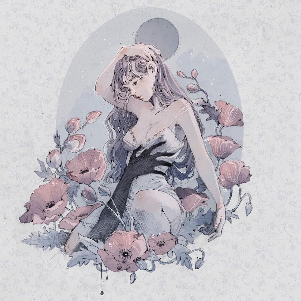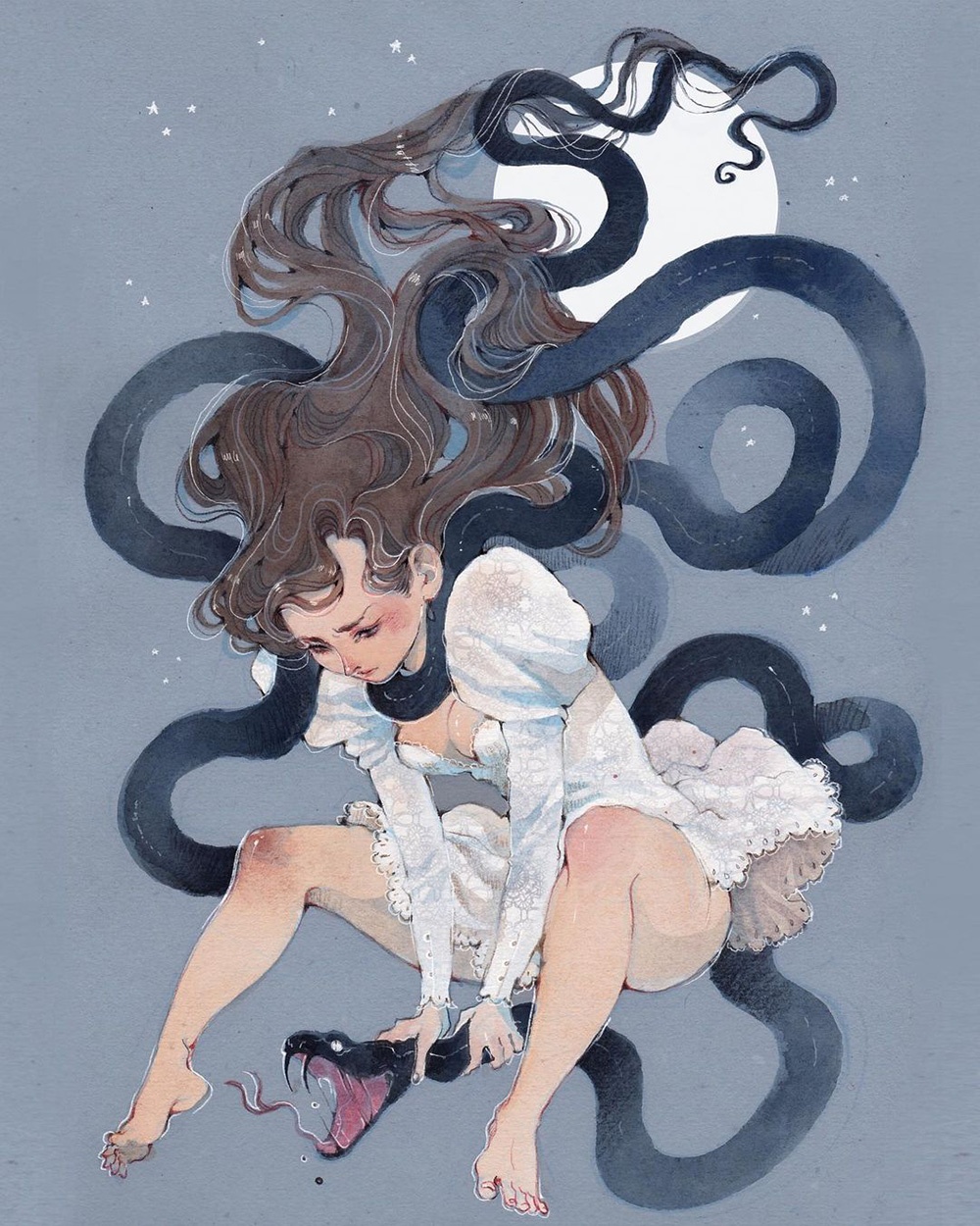 Le contraddizioni decisamente non terminavano nel contrasto tra stile e contenuti, perché Jessica Cioffi, in arte Loputyn, è una giovane artista italiana dallo stile incredibilmente maturo e dallo straordinario talento. Matite delicate ed impalpabili acquerelli definiscono il fascino etereo di queste figure femminili dall’eleganza vittoriana. Un’atmosfera misteriosa ed inquietante si nasconde dietro il fruscio di seta e trine, aspettando la propria vittima: colei che non potrà mai più voltarsi e dimenticare ciò che ha scoperto. Eccomi.