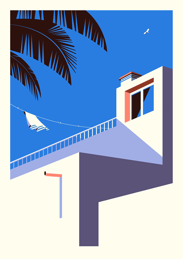 The process is one of reduction so order to reduce I always need more to start with. The first thing I do is throw big areas of colours around and have a feel for the balance of shapes and colours. I draw the elements very loosely until I reach a composition that feels together. Once that is done I go back in and draw every detail perfectly before removing them one by one until I can’t reduce the image anymore.