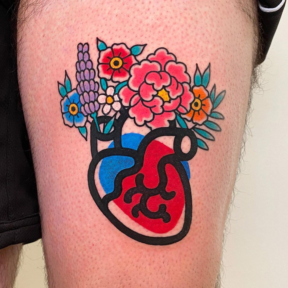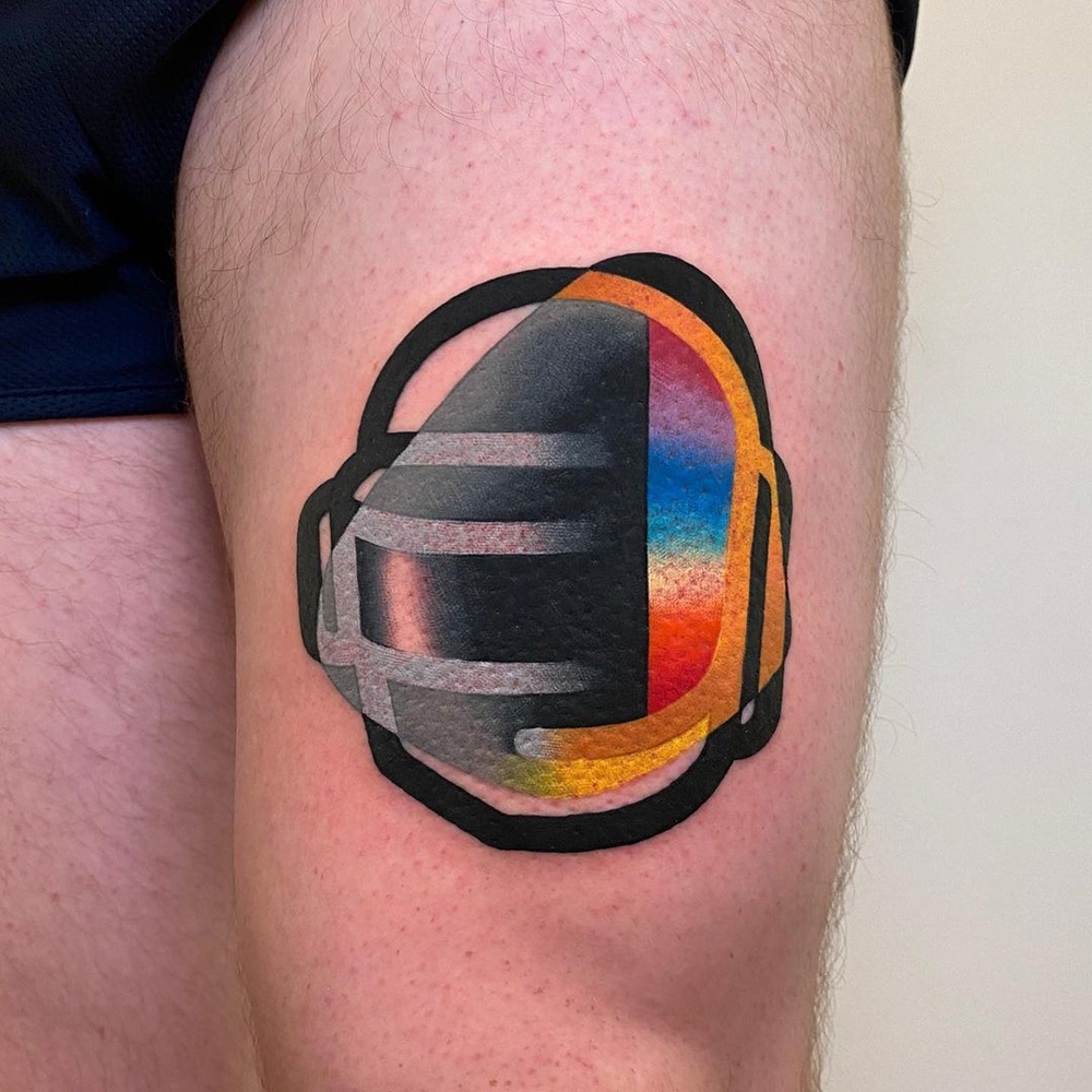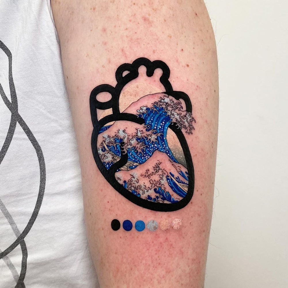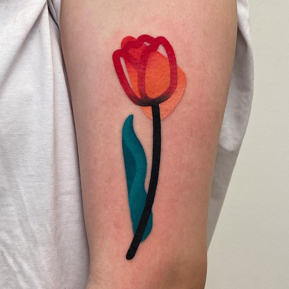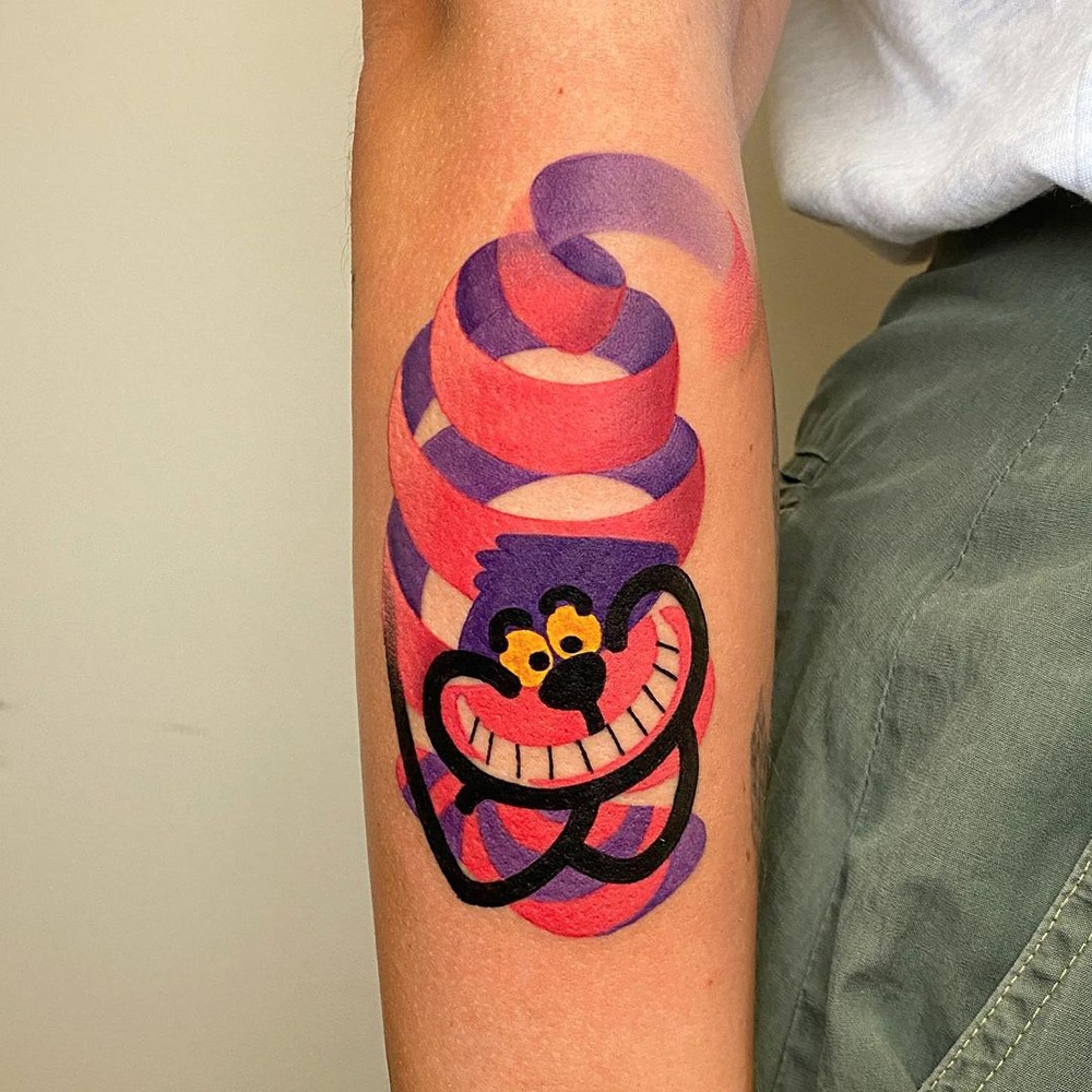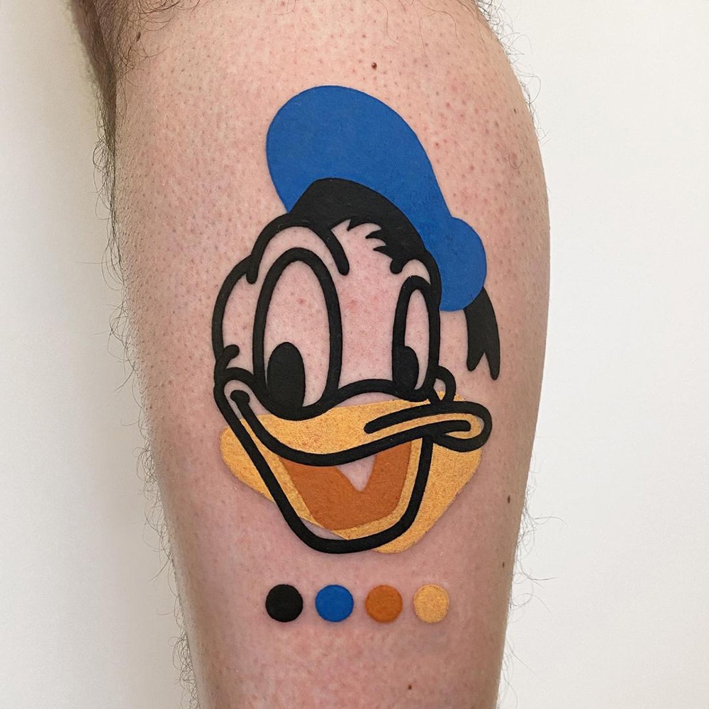 Nei suoi lavori ogni soggetto è abbinato a una forma, tracciata con linee spesse e nere, che si sovrappone al disegno principale, ricco di colori e sfumature. Come spiega l’autore stesso, il processo creativo di un tatuaggio o di un’illustrazione si conclude quando tra le linee e le chiazze di colore si riesce a intravedere un’armonia chiara, che racconti una storia.