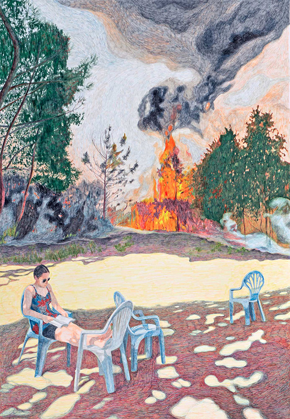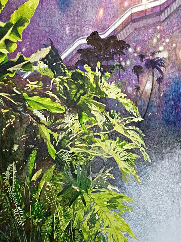 L’originalità straordinaria delle opere di Manon Molesti risiede nella tecnica, che si basa esclusivamente sull’uso di pennarelli a inchiostro di china. L’artista e illustratrice francese li miscela per sovrapposizione fino ad ottenere le luminose tonalità delle sue composizioni.