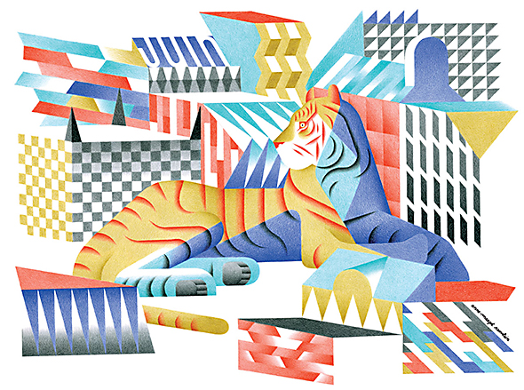 La prima cosa che colpisce è lo stile molto personale delle sue illustrazioni. Anzi, dovremmo parlare di un doppio stile, perché quello utilizzato per l’esecuzione digitale è molto asciutto e geometrico, mentre quello a mano libera è quasi pittorico e ricorda certe soluzioni formali del cubismo. In quest’ultimo caso la tessitura del pastello diventa vibrante e prismatica, facendo brillare le immagini rappresentate.