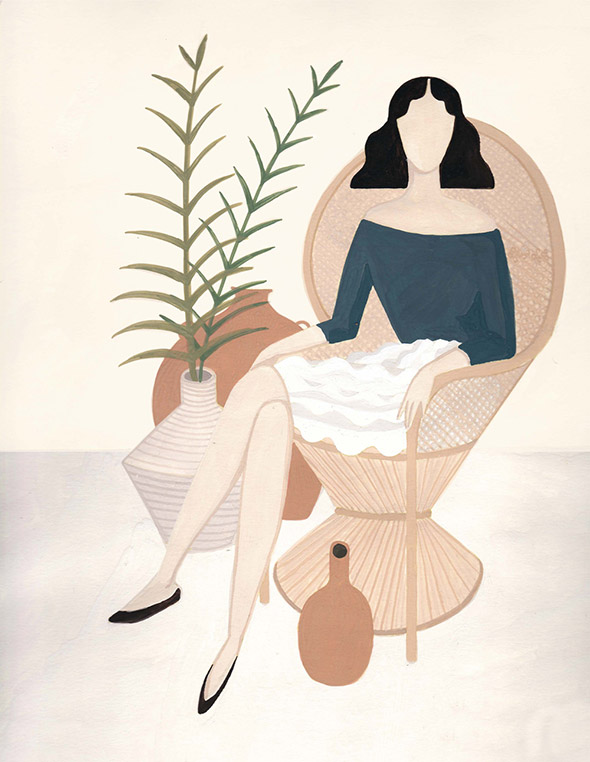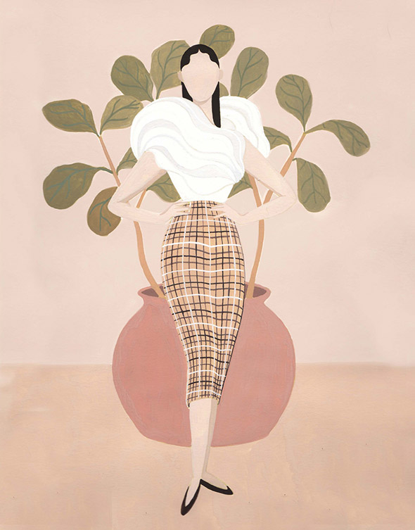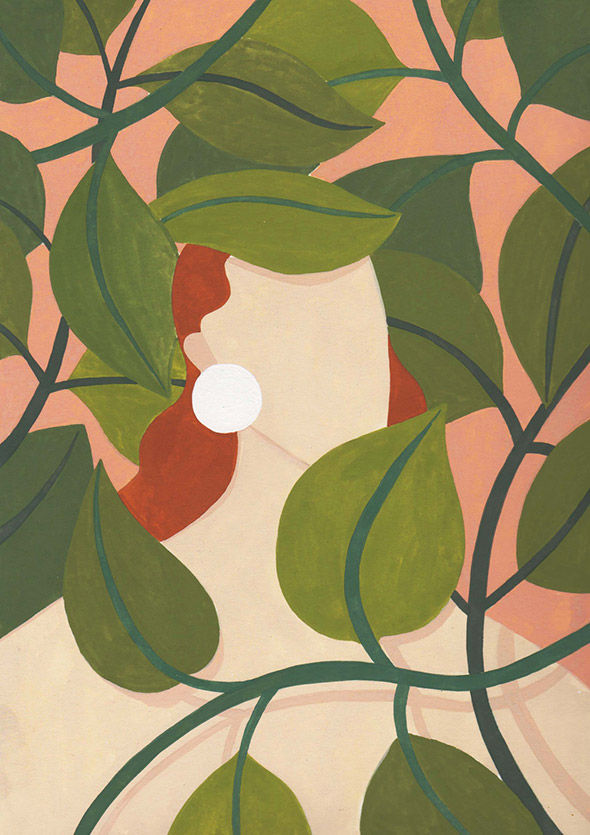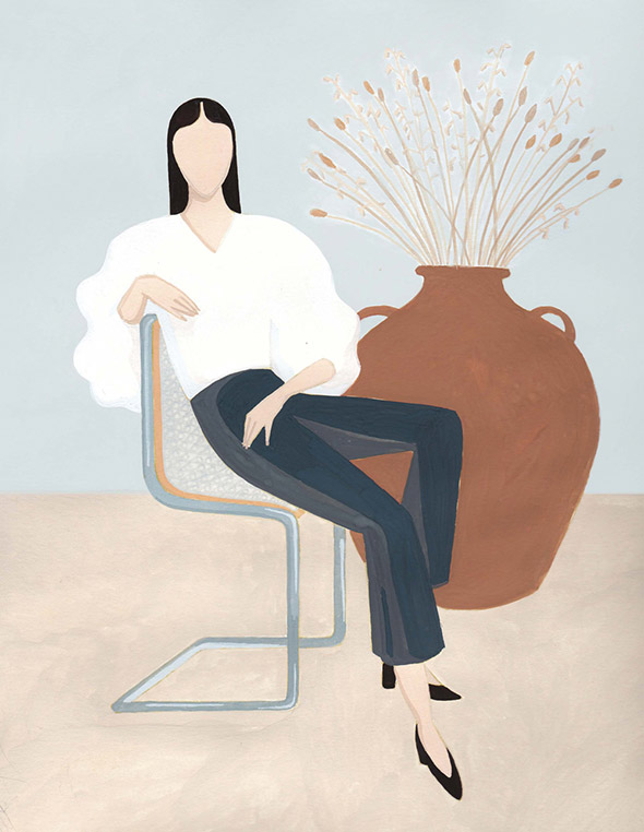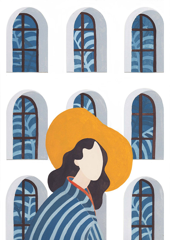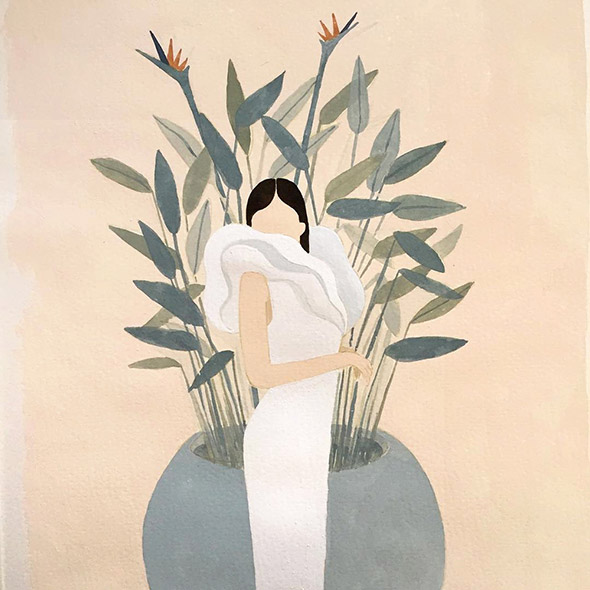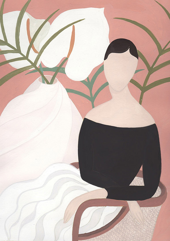 La natura, il design vintage anni ’60, l’arte rinascimentale, l’architettura e la moda sono tra le sue principali fonti di ispirazione. Le ritroviamo come “ingredienti” compositivi dei suoi lavori, a metà strada tra illustrazione e pittura, costruiti secondo un’armonia geometrica minimale dall’impianto classico e caratterizzati da una palette cromatica giocata sui mezzi toni. Le donne senza volto che dominano le sue composizioni sembrano personaggi metafisici dechirichiani. In realtà la loro espressività si riflette in ciò che le circonda: esse stabiliscono un’unione sensibile tra lo spazio e i sentimenti umani, in un gioco di rimandi reciproci.