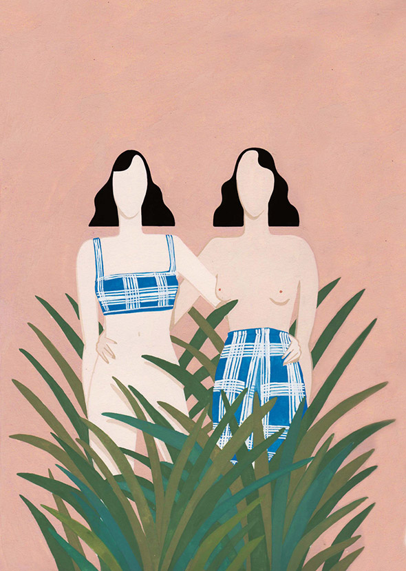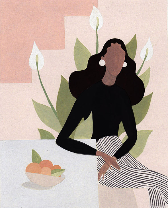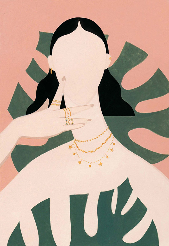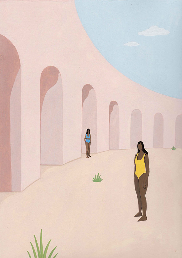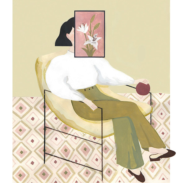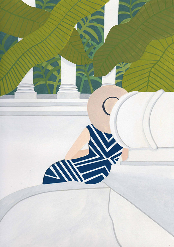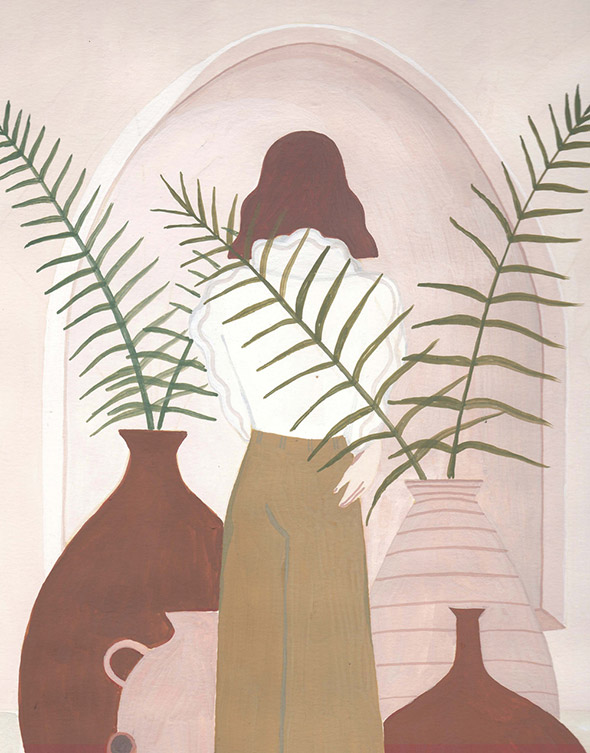 La natura, il design vintage anni ’60, l’arte rinascimentale, l’architettura e la moda sono tra le sue principali fonti di ispirazione. Le ritroviamo come “ingredienti” compositivi dei suoi lavori, a metà strada tra illustrazione e pittura, costruiti secondo un’armonia geometrica minimale dall’impianto classico e caratterizzati da una palette cromatica giocata sui mezzi toni. Le donne senza volto che dominano le sue composizioni sembrano personaggi metafisici dechirichiani. In realtà la loro espressività si riflette in ciò che le circonda: esse stabiliscono un’unione sensibile tra lo spazio e i sentimenti umani, in un gioco di rimandi reciproci.