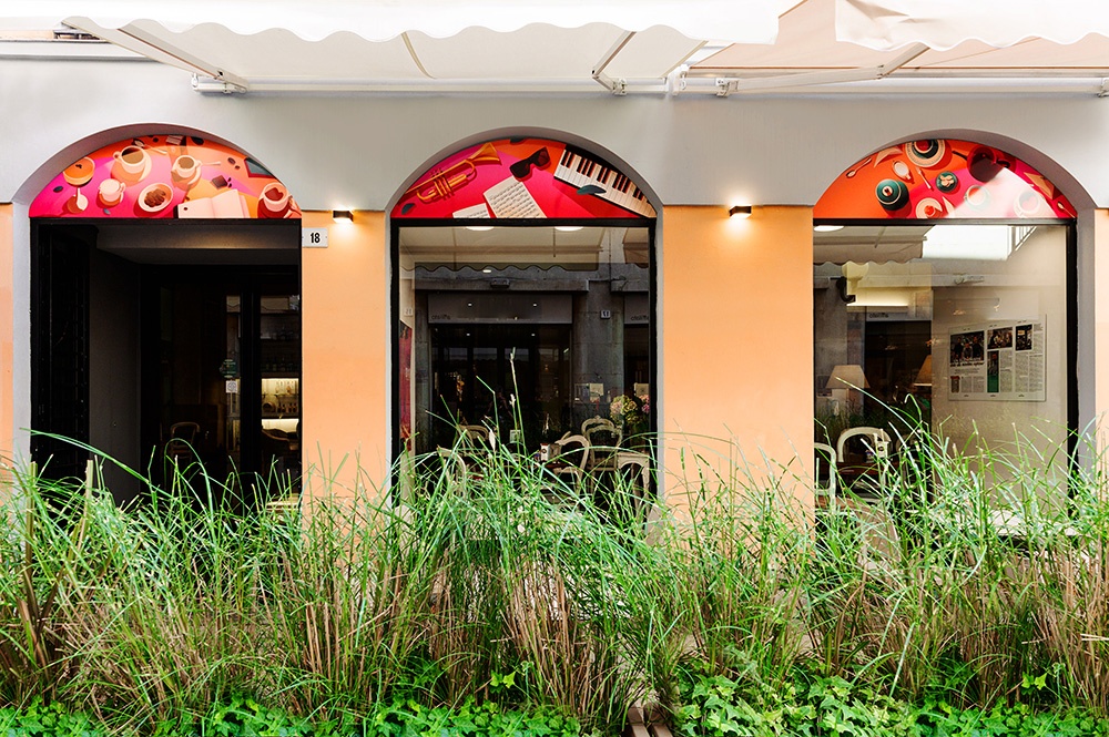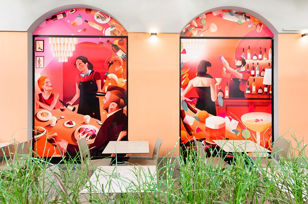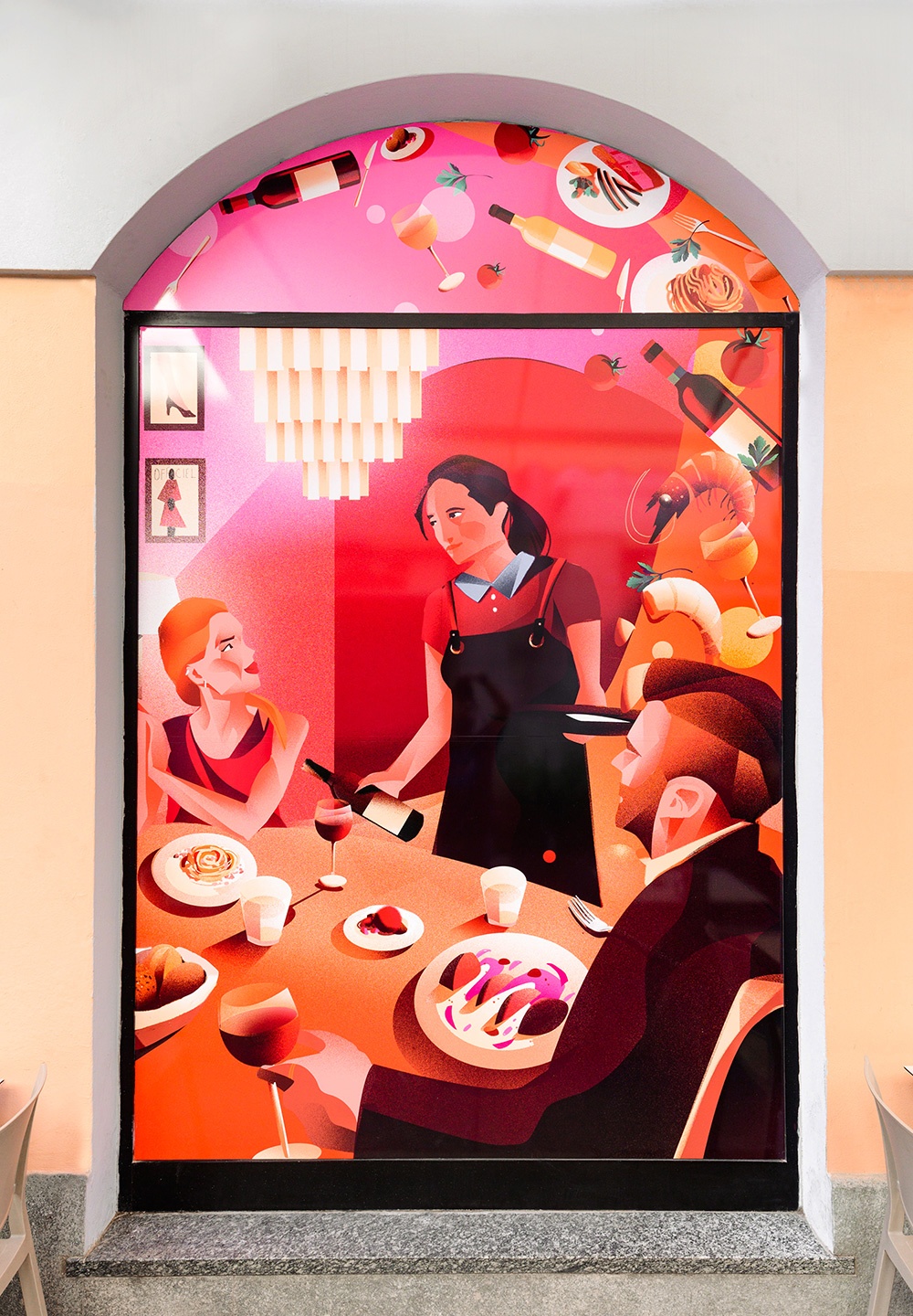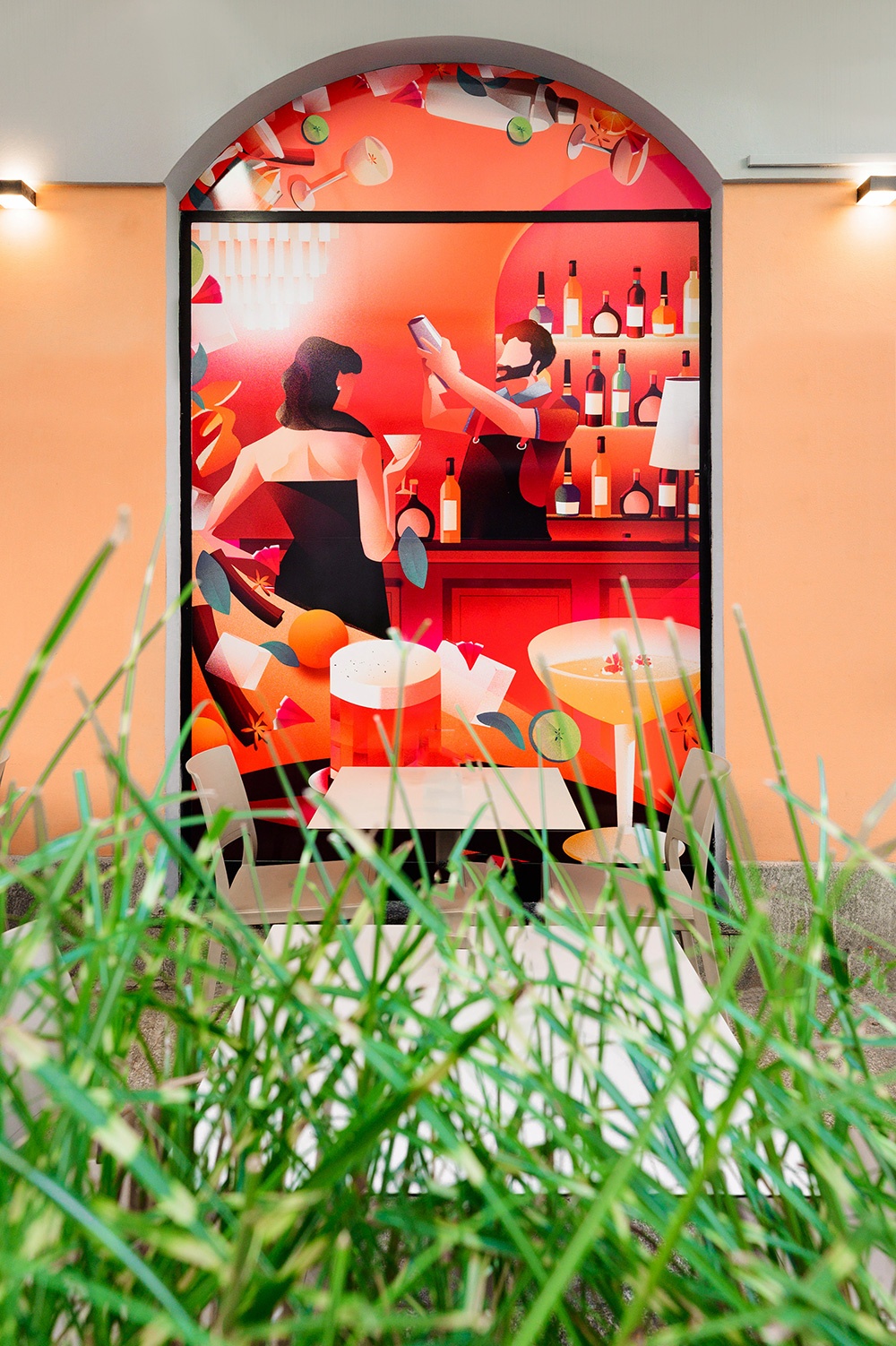 “Sin da quando ho ricevuto le prime foto e il brief del progetto ho sentito subito fosse nelle mie corde. L’ispirazione è arrivata immergendomi nelle atmosfere del locale, nel mood vintage che trasmette. Per dare movimento ho pensato di utilizzare colori sgargianti e composizione dinamiche, ricche di texture e dettagli, che valorizzassero l’equilibrio tra il look “d’altri tempi” di Melchionni Cafè con l’offerta moderna e ricercata”