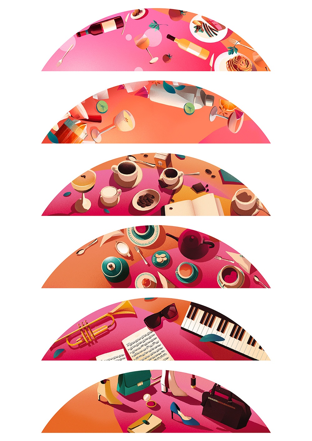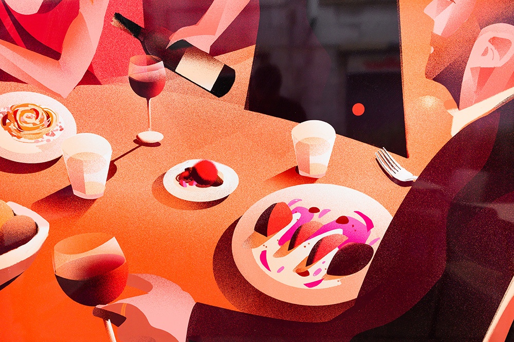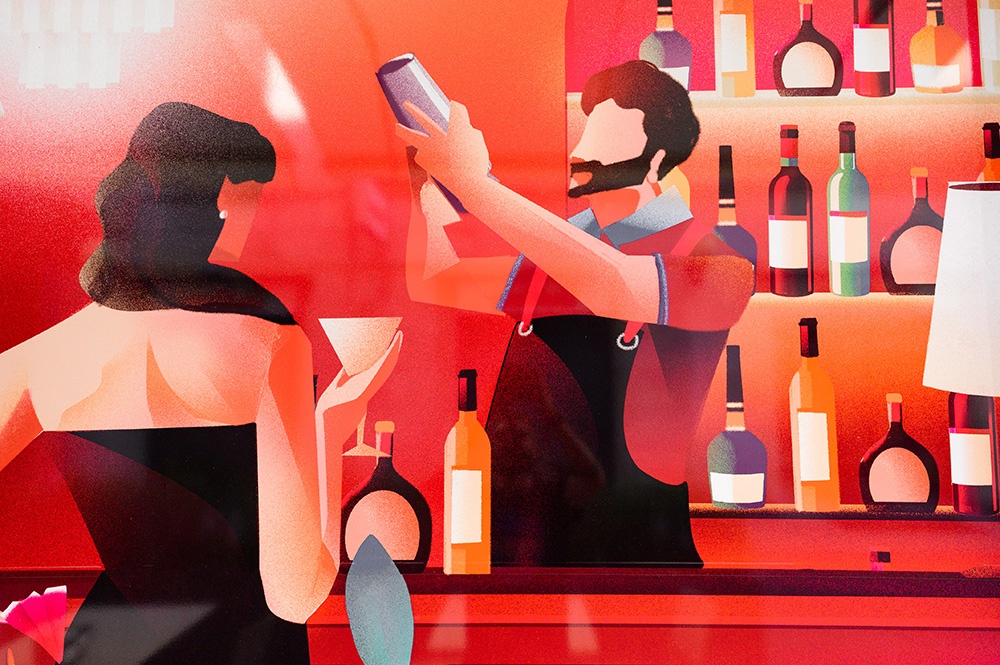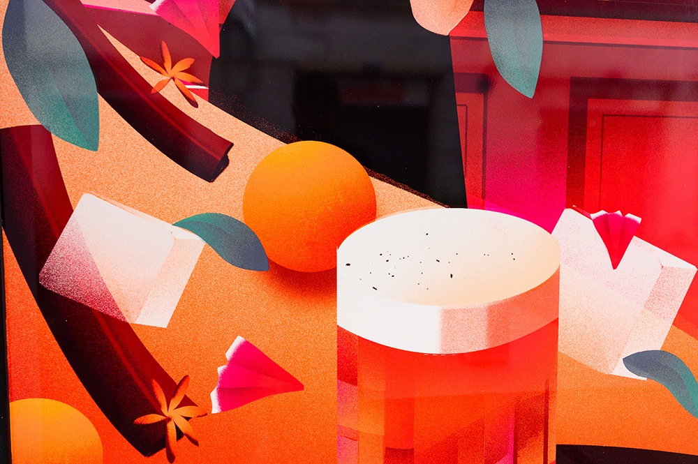 “Sin da quando ho ricevuto le prime foto e il brief del progetto ho sentito subito fosse nelle mie corde. L’ispirazione è arrivata immergendomi nelle atmosfere del locale, nel mood vintage che trasmette. Per dare movimento ho pensato di utilizzare colori sgargianti e composizione dinamiche, ricche di texture e dettagli, che valorizzassero l’equilibrio tra il look “d’altri tempi” di Melchionni Cafè con l’offerta moderna e ricercata”