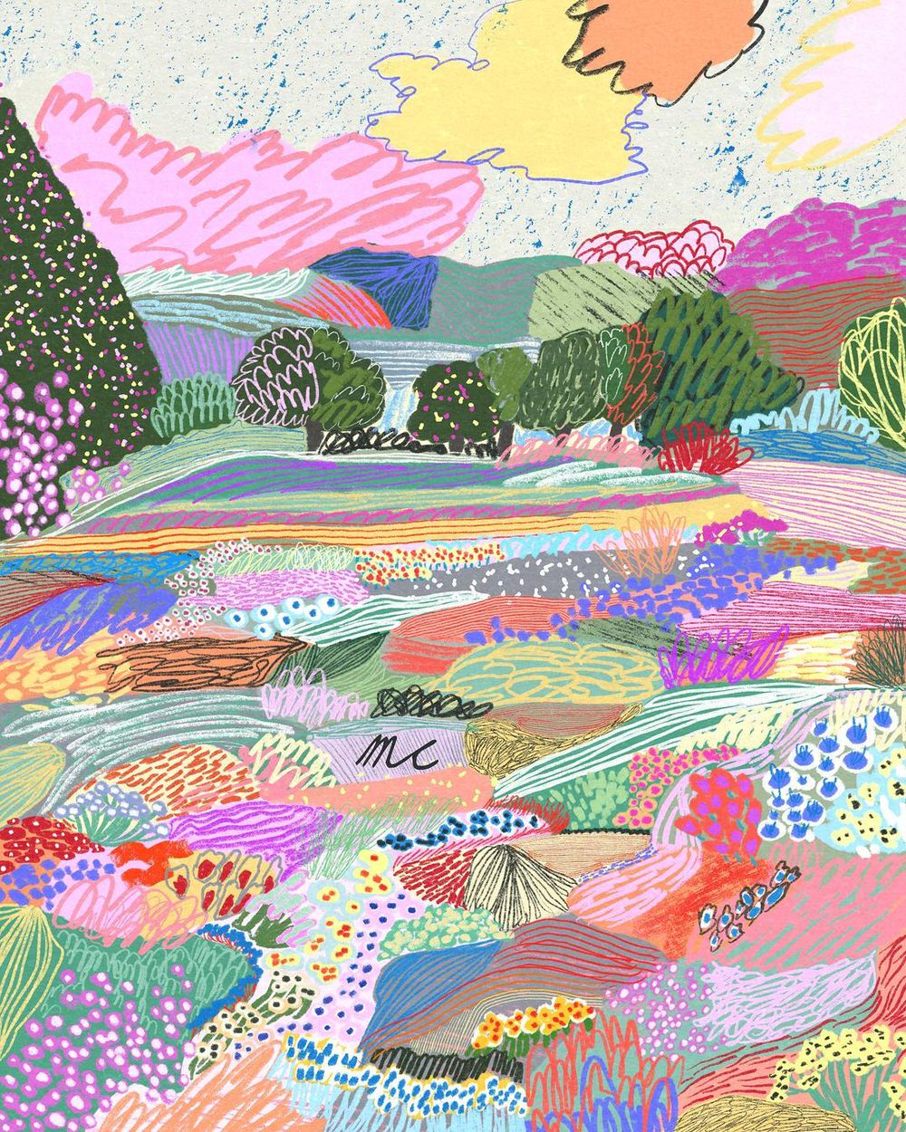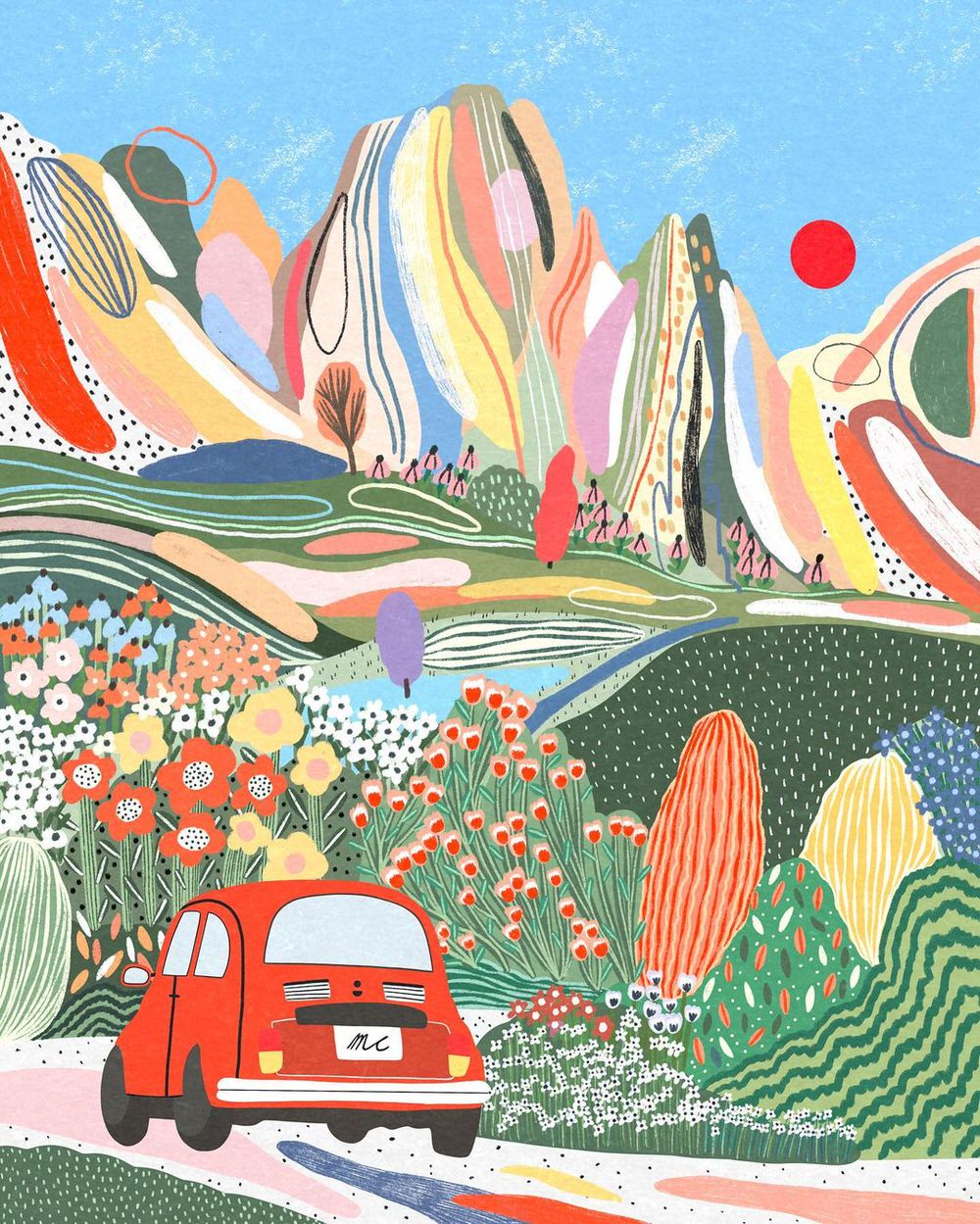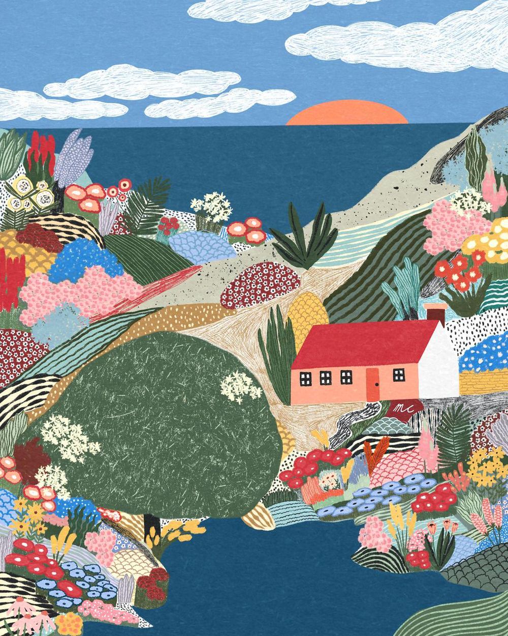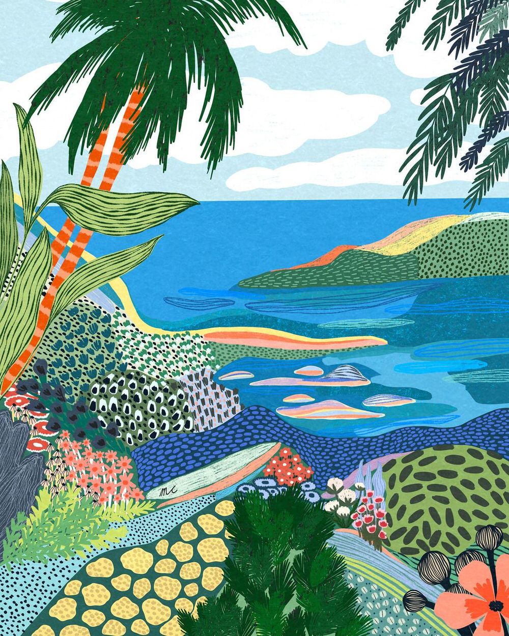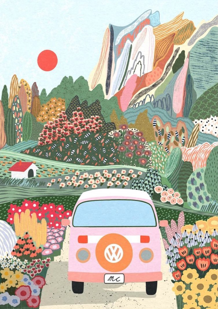 Anche quando si scorgono case, figure umane o automobili, il fulcro delle illustrazioni digitali di Marina Ester Castaldo, illustratrice e designer napoletana residente a Londra, è sempre il paesaggio naturale: avvolgente, rigoglioso, saturo di colori e profumi che quasi riusciamo a percepire.