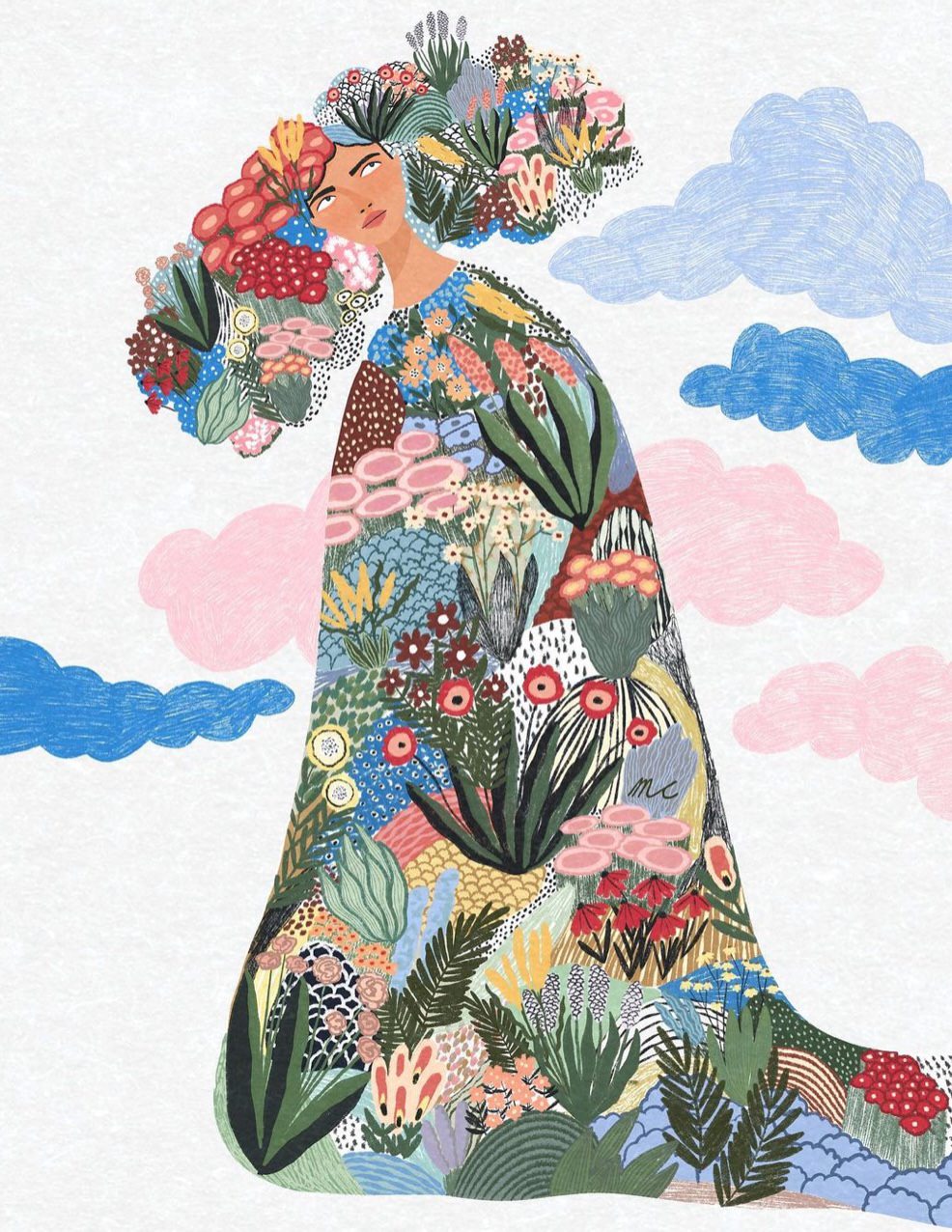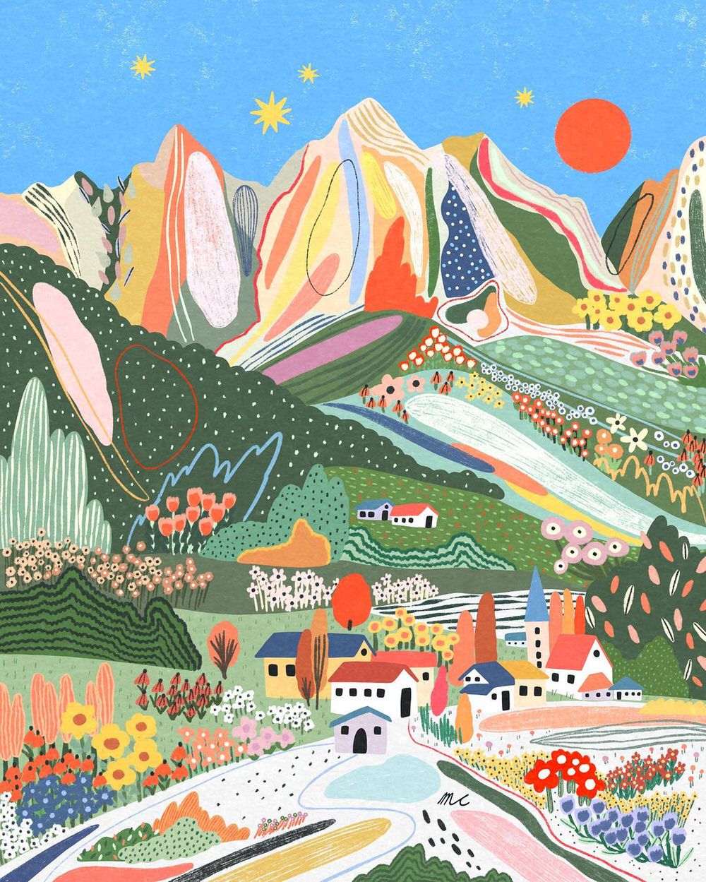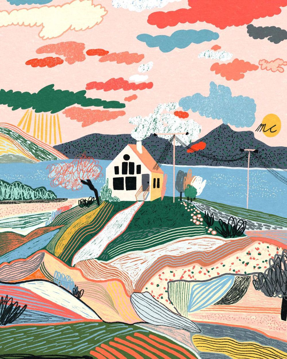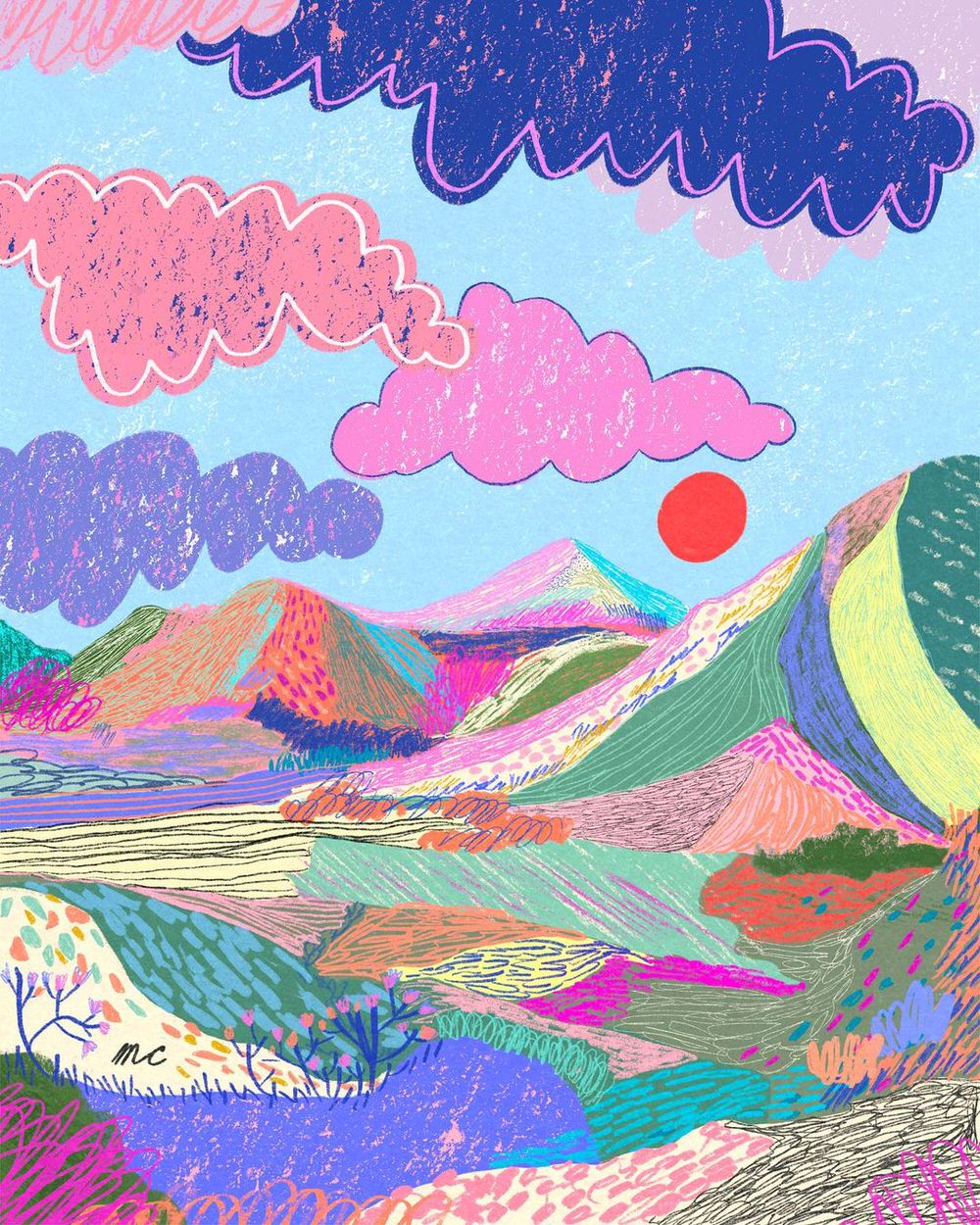 Anche quando si scorgono case, figure umane o automobili, il fulcro delle illustrazioni digitali di Marina Ester Castaldo, illustratrice e designer napoletana residente a Londra, è sempre il paesaggio naturale: avvolgente, rigoglioso, saturo di colori e profumi che quasi riusciamo a percepire.