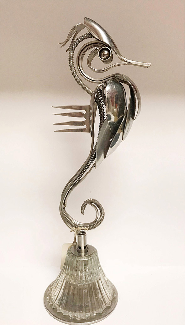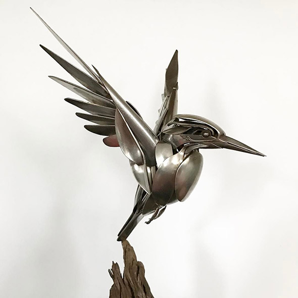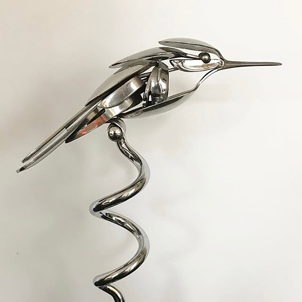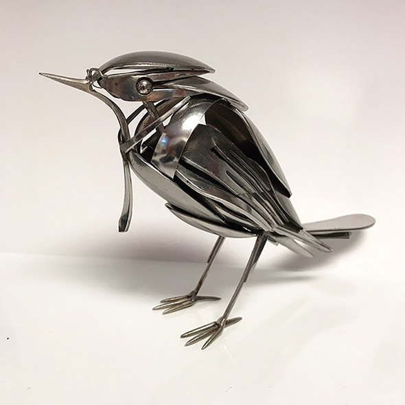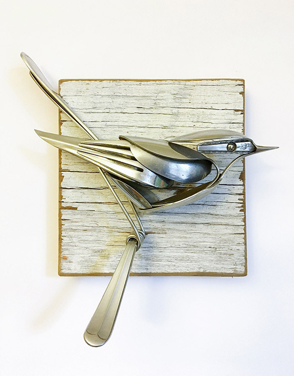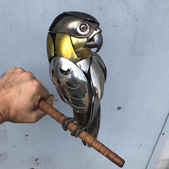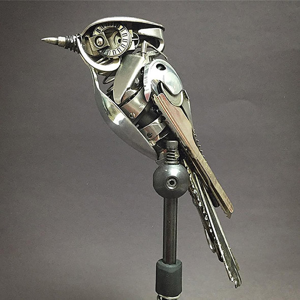 Capita di rompere oggetti che amiamo e di essere costretti a disfarcene perché divenuti inservibili. Capita di trovare oggetti rotti, pensare che siano bellissimi, e dolere un po’ del fatto che non servano più a nulla. Capita anche che qualcuno con molto, molto talento, prenda quegli oggetti e ne faccia qualcosa di nuovo e incredibilmente poetico, come trasformarli in gioielli di plastica e ferro dalle forme animali, ispirate dalla natura e dall’immaginario steampunk. “Le mie sculture descrivono i continui cicli vitali che, consciamente o inconsciamente, permeano la nostra consapevolezza. Gli oggetti riciclati che creo sono una testimonianza della convinzione di conservare e apprezzare le nostre risorse, così che l’ambiente in cui viviamo sia quello in cui desidereremo continuare a vivere”.