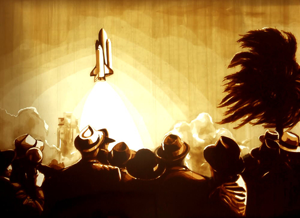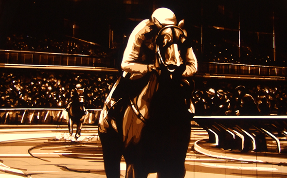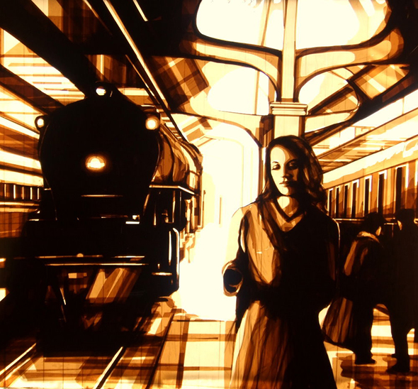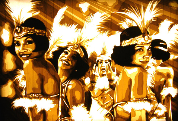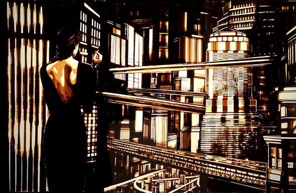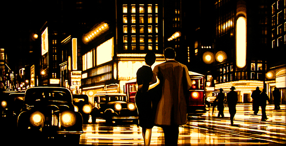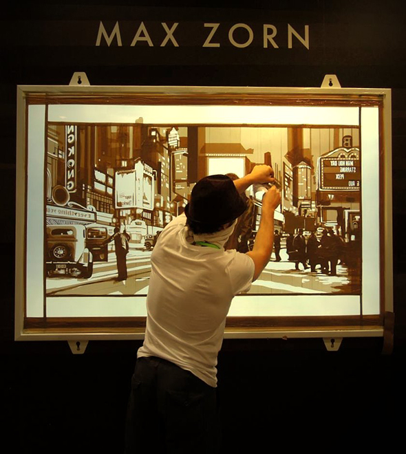 Da allora Max non si è più fermato e ha lasciato traccia delle sue opere sulle superfici illuminate di tutto il mondo, nelle strade e nelle gallerie. Usa il bisturi per tagliare il nastro da pacchi come un pennello, un pannello di plexiglass retroilluminato come supporto e, grazie alla trasparenza del materiale, strato dopo strato ottiene diverse gradazioni di chiaro-scuro che danno profondità alle sue creazioni. I suoi soggetti sono spesso ispirati al cinema vintage in bianco e nero, all’arte, alle celebrità.