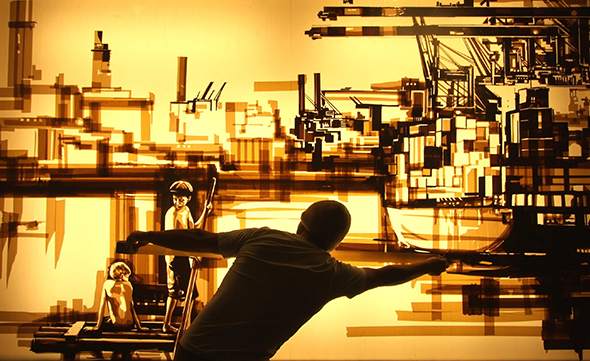 “L’idea di usare il nastro invece dei colori mi è stata suggerita da un amico che lavorava in una carrozzeria e usava il tipico nastro adesivo per delimitare le aree da verniciare. E l’idea di usare la luce per illuminare i miei lavori me l’hanno suggerita i lampioni, mentre facevo una corsa di notte per Amsterdam. Ho subito pensato che la loro luce dorata fosse perfetta per una galleria all’aperto”.