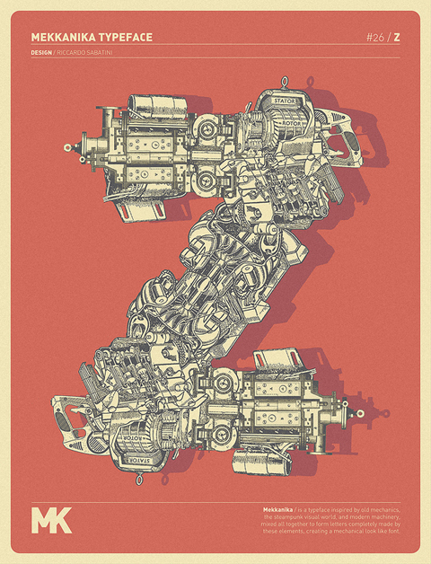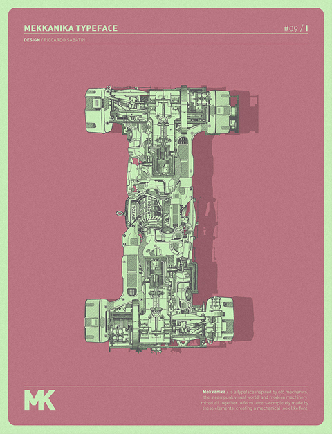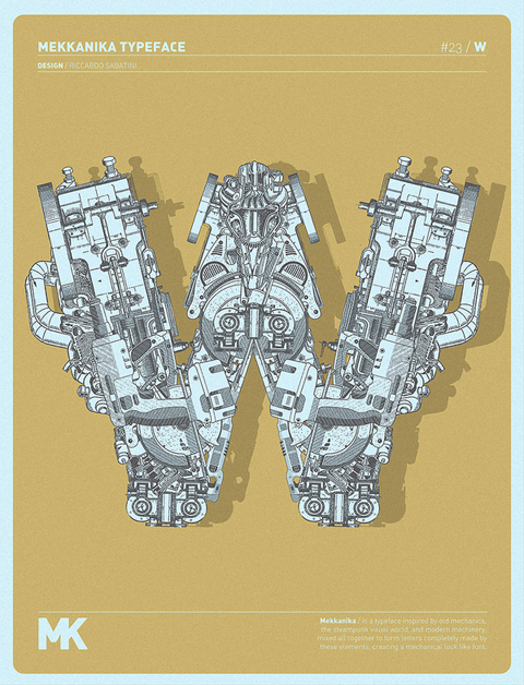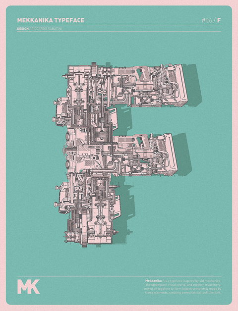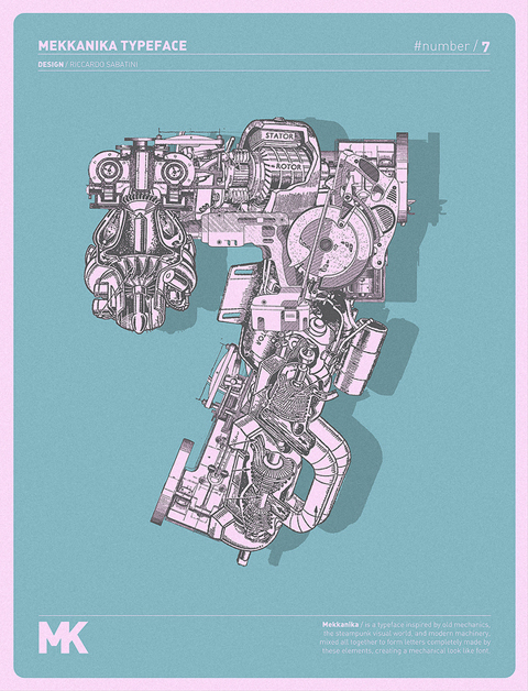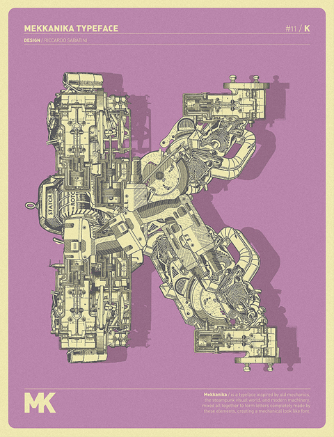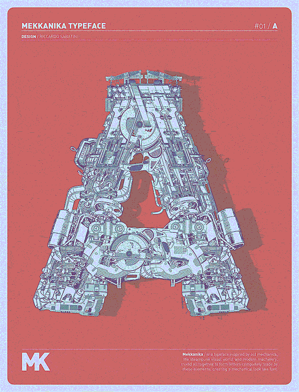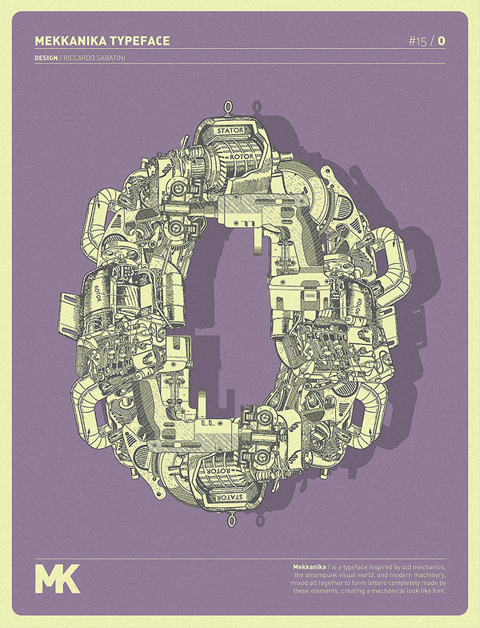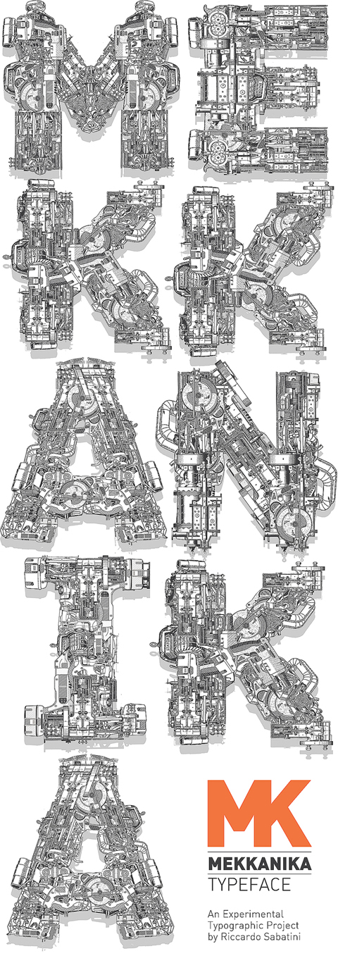 Riccardo Sabatini di racconta così: 60 kg italian ignorance + 5 kg low quality creativity + 5 kg bad visual taste + 5 kg face like the ass + 10 kg presumption + 5 kg madness = 95 kg of me. Il font sperimentale Mekkanika è uno dei suoi progetti più recenti, lo trovate all’interno del post.