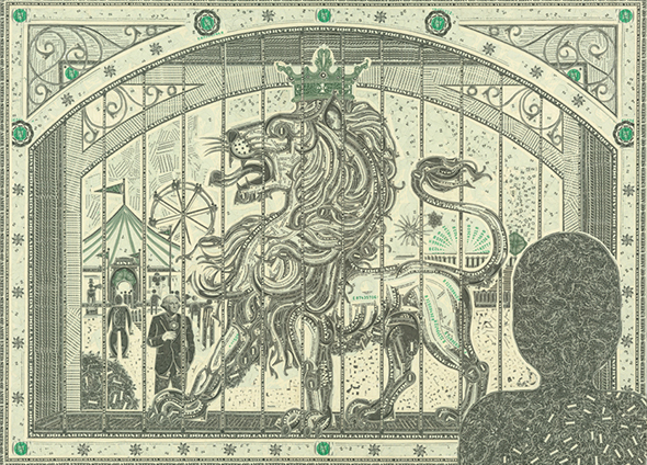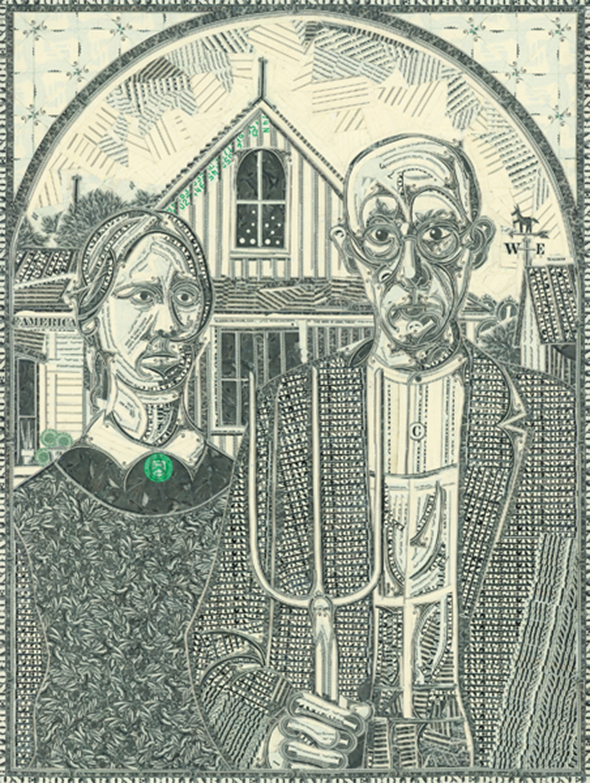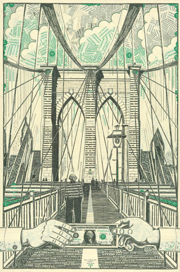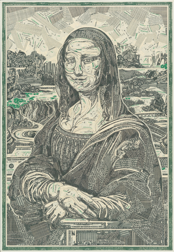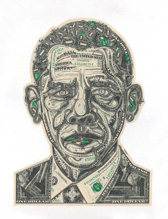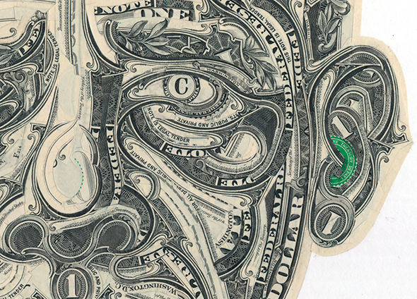 Le sue opere valgono migliaia di dollari, e non serve un critico per dedurlo. Non stiamo parlando, infatti, di quotazioni sul mercato dell’arte, bensì del fatto che l’artista statunitense Mark Wagner realizza i suoi collage con un subisso di frammenti di banconote da 1$, minuziosamente ritagliati e riorganizzati e infine assemblati dando vita a qualcosa di simile ad arazzi o mosaici che rappresentano ritratti, paesaggi, episodi storici e racconti mitologici. Il simbolo del capitalismo per eccellenza diventa così un comune strumento estetico, un materiale maturo intrinseco di significato.