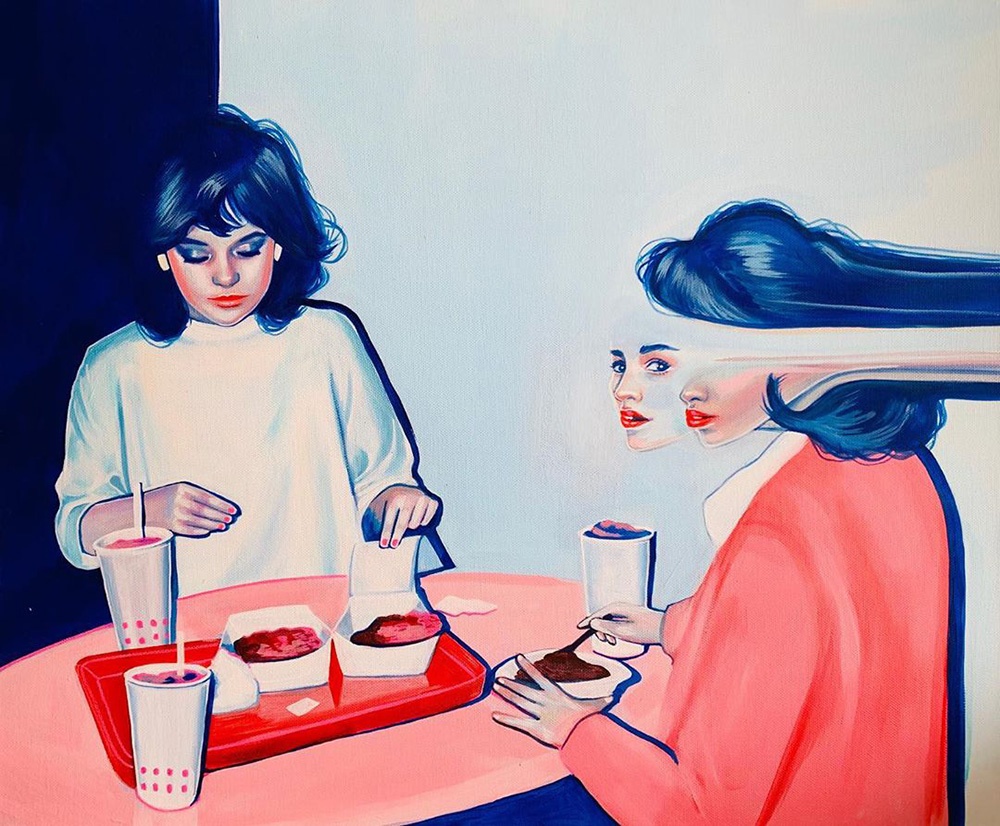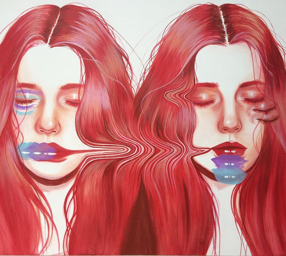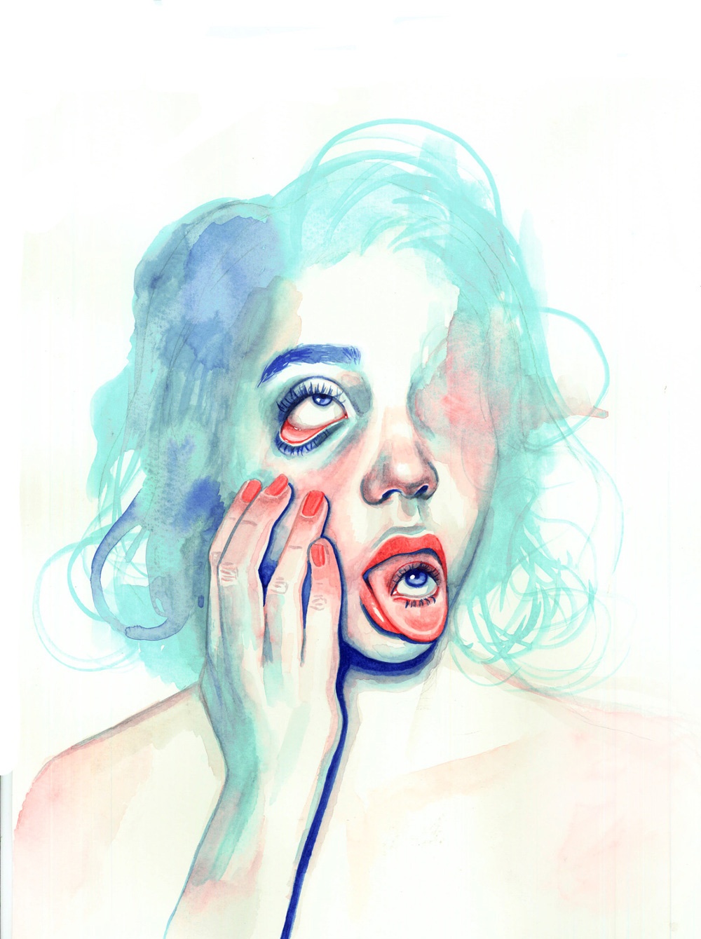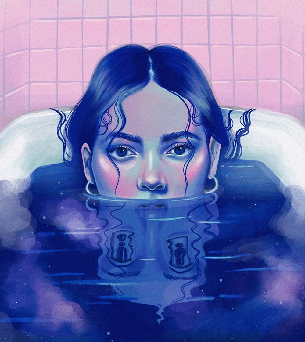 Monica Loya ne è un esempio calzante. Le sue illustrazioni indagano le sensazioni più intime della mente umana e si collocano sulla sottile linea che divide il mondo fisico da quello psichico, spesso rompendo questo confine e lasciando che i due mondi si invadano l’un l’altro fino a diventare indistinguibili. Gli oggetti e i volti ad un certo punto si dissolvono, i connotati si mescolano, lo spazio si piega fino a distorcere la realtà. Ogni opera è una metafora in cui possiamo specchiarci e a cui possiamo attribuire arbitrariamente un significato perchè in essa riconosciamo un nostro stato d’animo. Così facendo l’opera stessa diviene al contempo consapevolezza e cura.