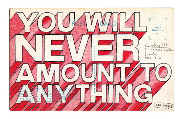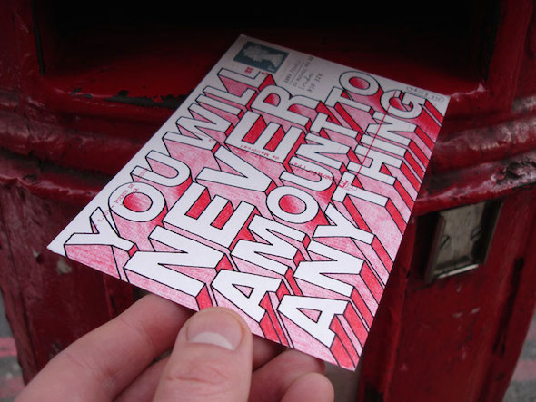 I was sitting in my studio late one night a few years ago and I tweeted “I will send an offensive postcard to the first person to reply to this tweet”. Lot’s of people replied and I sent the winner, Jonathan Hopkins, a postcard telling him to fuck off and that he had shit legs. People really seemed to enjoy it so I opened a service a few days later, inviting strangers to pay to be insulted.