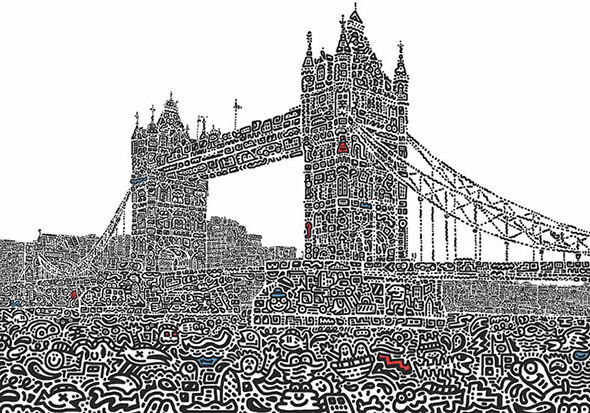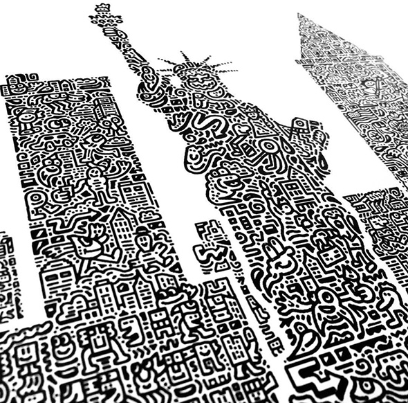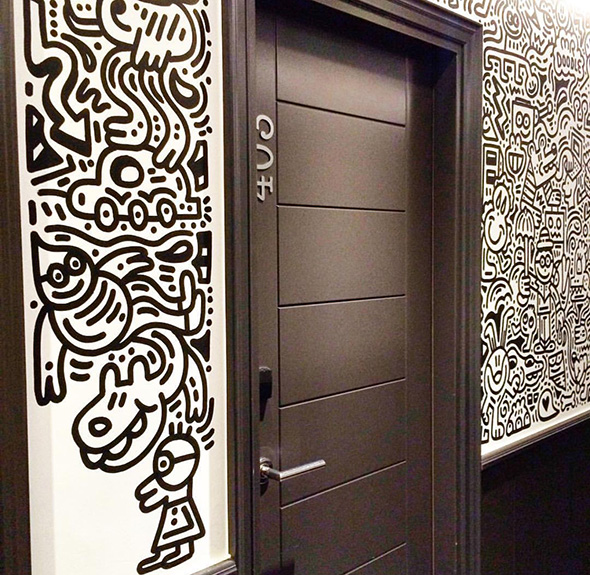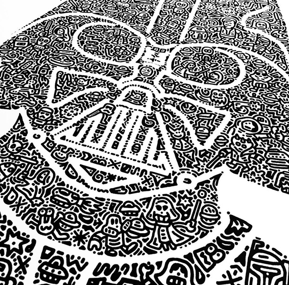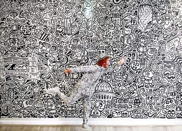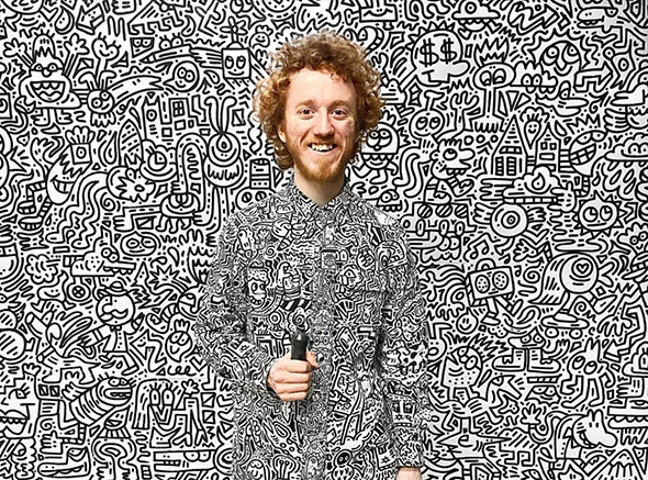 Nella sua concisa biografia si legge: “Non stop crazy doodler doodling everywhere!“. Il suo stile, rigorosamente in bianco e nero, è stato spesso paragonato ad un virus, che si moltiplica fino a ricoprire completamente lo spazio circostante. Mr. Doodle lo ha anche declinato su una serie di simpatici gadget che trovate in vendita sullo shop online. Tra i suoi obiettivi c’è quello di disegnare un milione di “doodles” utilizzando l’iPhone, e da quel che ho visto non sembra del tutto irrealizzabile.