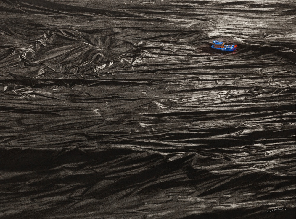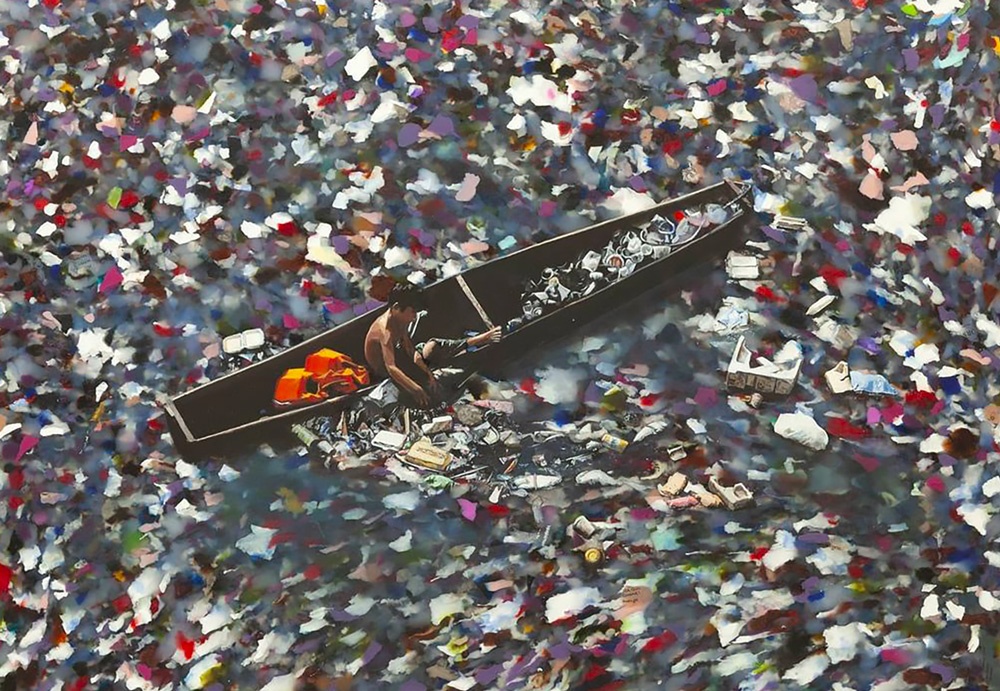 Quest’opera ritrae un bambino in una piroga mentre naviga in una delle famigerate isole di plastica: per realizzarla gli artisti hanno usato come base una lastra di plastica ottenuta riciclando flaconi di prodotti cosmetici.