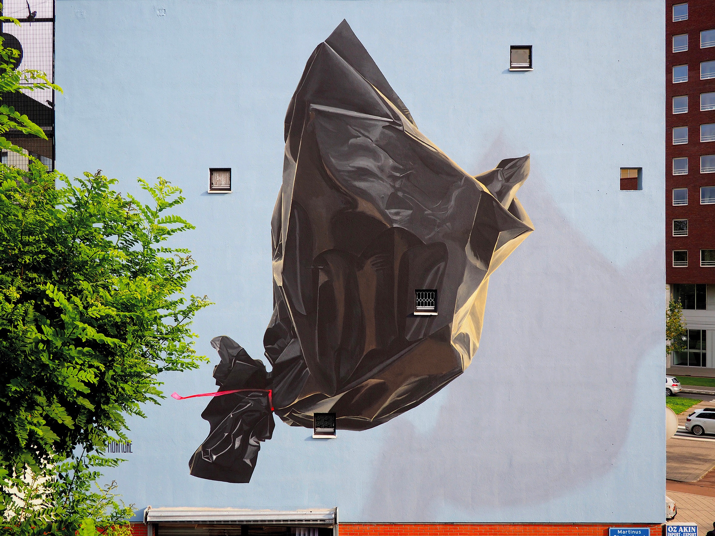 “Garbage Bird” ad acrilico sui muri di Rotterdam.