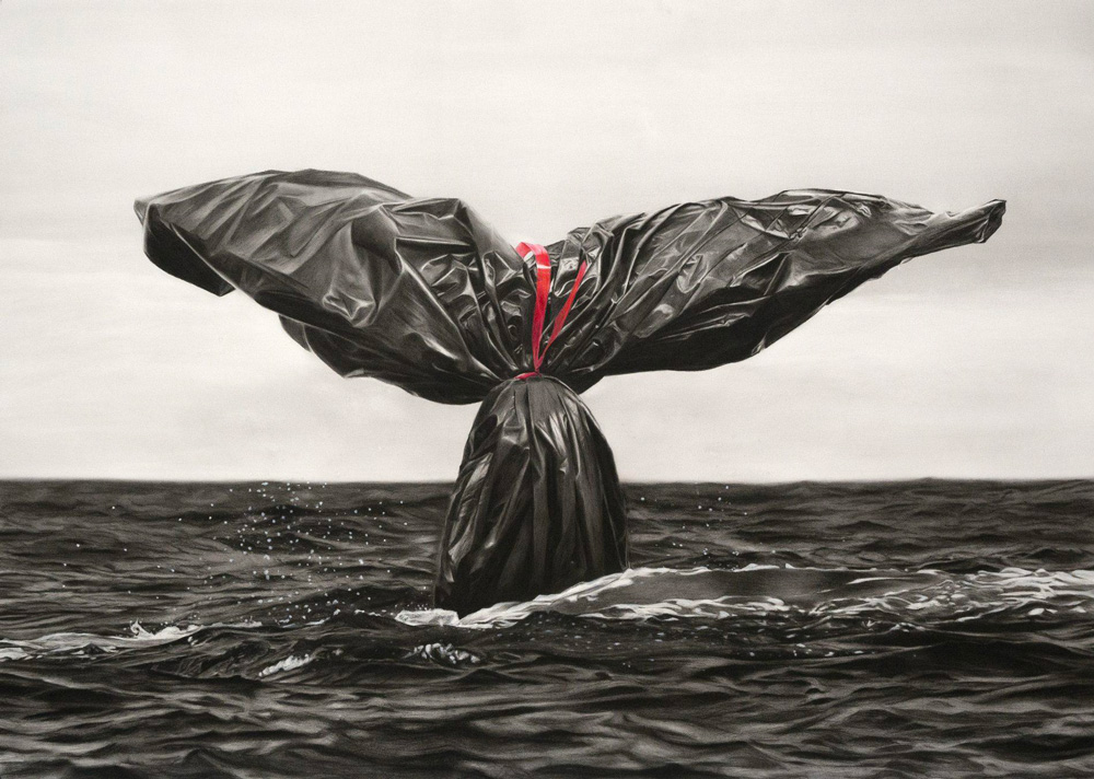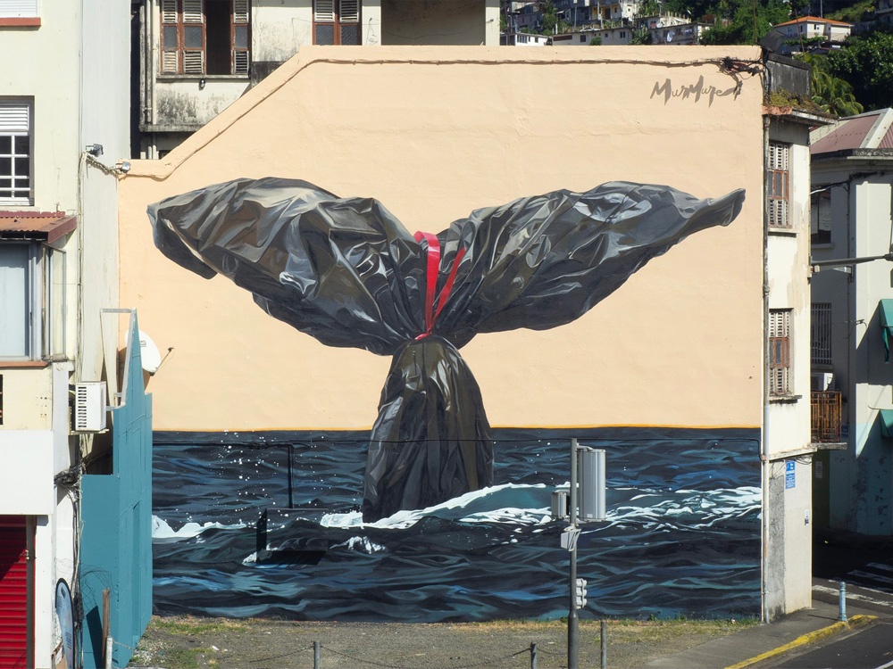 “Garbage Tail” rappresenta solo la coda di una balena che, come la punta di un iceberg, nasconde il problema più grande, o invisibile come la microplastica, sotto la superficie del mare. Questa è la versione murales, realizzata a colori acrilici in Martinica.