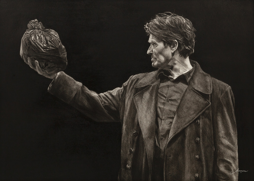 Lo stesso soggetto, nella versione a matita e carboncino su carta, ci permette di apprezzare il virtuosismo e la padronanza tecnica del duo