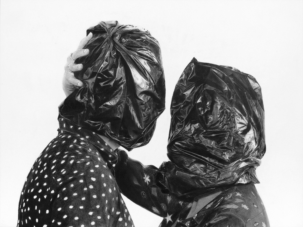 “Les Amants” è volutamente ispirata all’opera omonima di Magritte e mette in evidenza il contrasto tra un gesto d’amore e l’efferatezza di un materiale pericoloso come quello della plastica