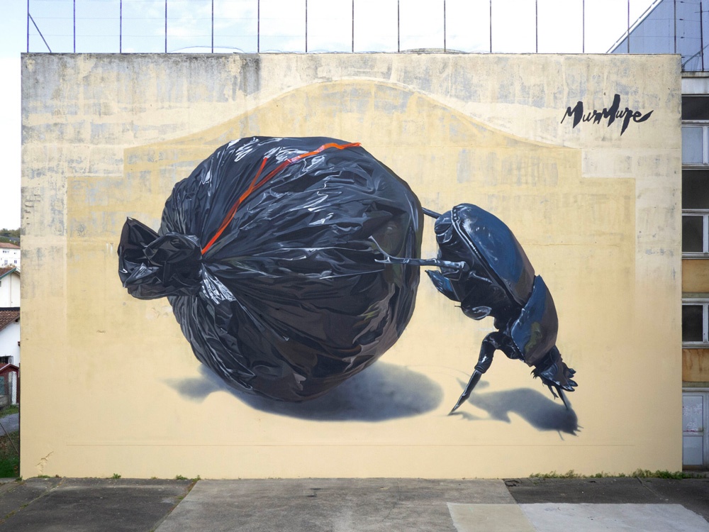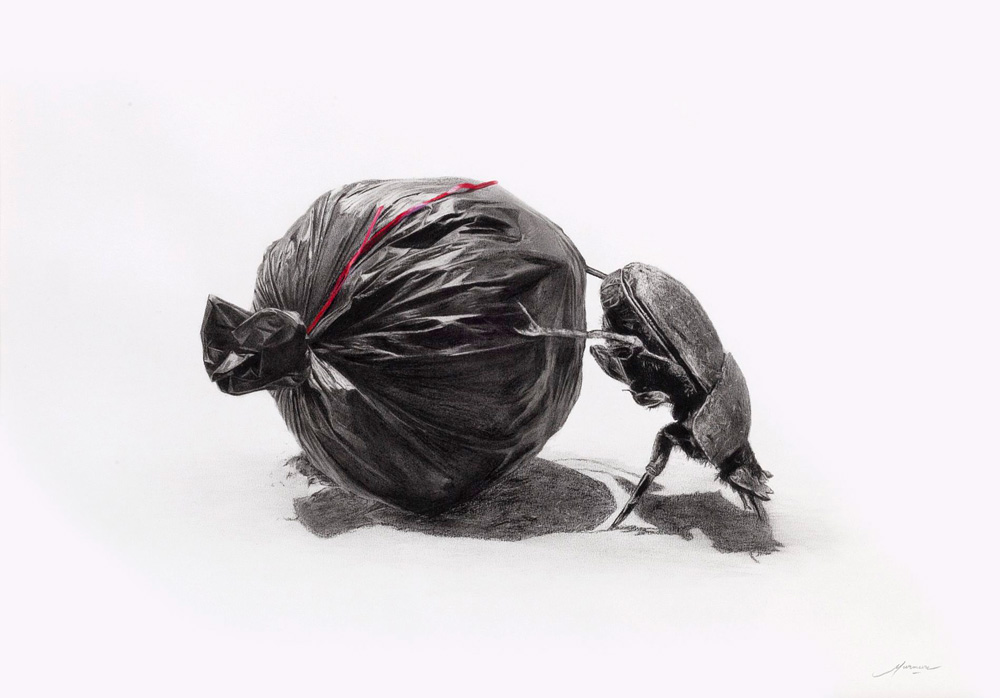 L’opera-manifesto forse più esemplificativa è quella dello scarabeo stercorario che fa rotolare un sacco dell’immondizia. Il risultato è un ossimoro perché la prima lettura è sì una chiara allegoria dell’inquinamento umano dovuto allo spreco, ma ci ricorda anche che in natura questo insetto coprofago è indispensabile all’ecosistema per la sua capacità di riciclare gli escrementi, contribuendo così alla buona fertilità del suolo; a differenza dell’uomo, che spera sia la natura a smaltire da sola i suoi “escrementi” industriali.