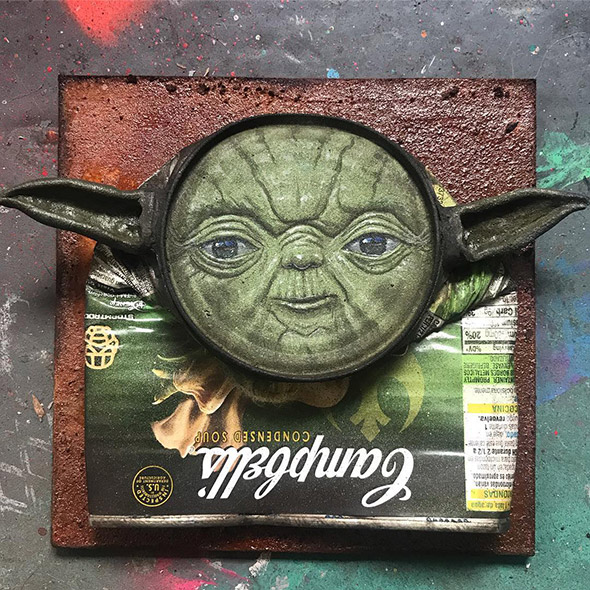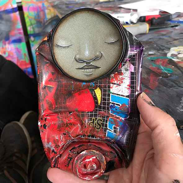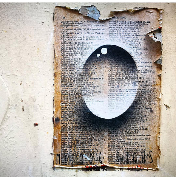 Ma esiste un approccio più naif dell’artista ed è ciò di cui vorrei parlarvi in questo articolo. Oltre alle pitture su larga scala infatti, My Dog Sighs raccoglie sporadicamente scatolette, vecchi libri, lattine e li trasforma, restituendoli alla strada con una nuova dignità e un nuovo messaggio. Il fattore che rende unica la sua operazione è il posizionamento di questi veri “objects d’art” in angoli più o meno nascosti della città. Tale gesto si manifesta quale sfida a interrogativi retorici ma non ancora risolti: Cos’è l’arte? Come la si riconosce? É arte solo quello che richiede un biglietto d’ingresso? Implicita è la provocazione verso le forme d’arte precostituite e il sistema declinato da gallerie e musei.