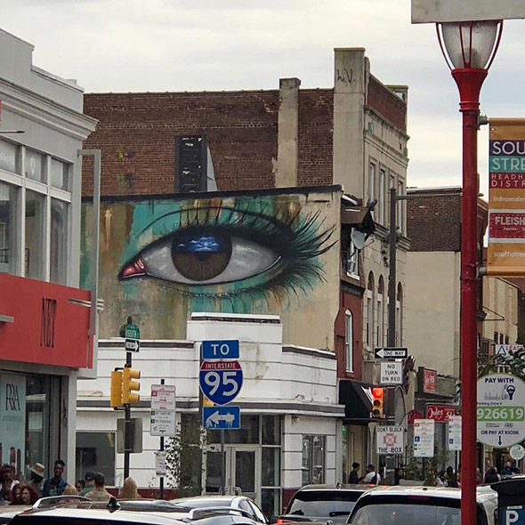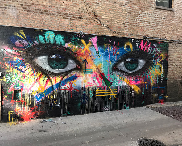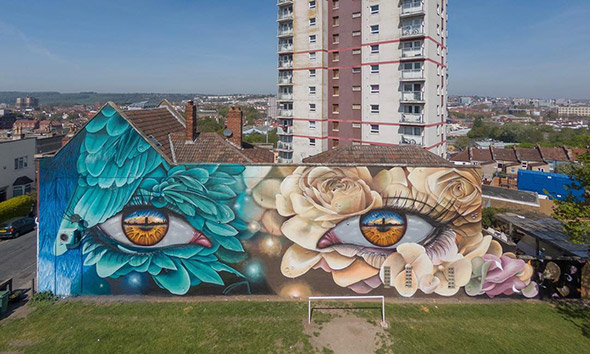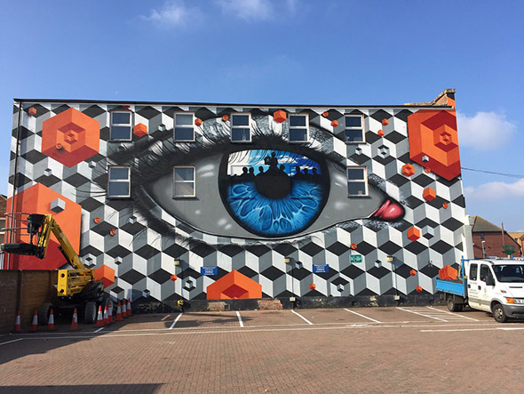 Come nel caso dell’artista inglese My Dog Sighs, che ha collaborato con l’illustratore Curtis Hylton al festival più di spicco della scena anglosassone: l’UpFest di Bristol. L’artista di Portsmouth è divenuto celebre per i suoi caratteristici occhi i cui tratti anatomici vengono alterati. É facile scorgere così nelle pupille, che si stagliano quasi sempre su sfondi ipercolorati, le sagome dei personaggi o gli skyline del luogo in cui l’artista opera.