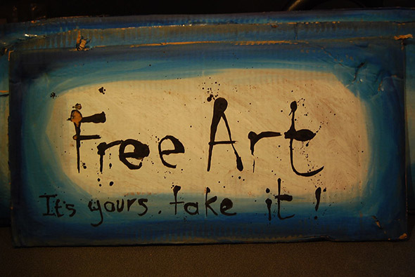 Non a caso al nome di My Dog Sighs viene spesso affiancato quello del Free Art Friday – movimento decennale di cui è fondatore – che prevede la fruizione dell’arte in maniera del tutto gratuita e la strada come punto di scambio e di incontro tra artisti e amatori. Artisti da tutto il mondo, indipendentemente dalla loro quotazione di mercato, spediscono le loro opere e chiedono agli artisti locali di posizionarle per la città. Chiunque passeggiando per le strade del proprio quartiere ne dovesse scoprire una può appropriarsene in maniera del tutto lecita. Gli analisti di mercato la chiamerebbero incontro tra domanda e offerta. Di fatto, il Free Art Friday si configura come uno dei movimenti legati all’arte più liberi e indipendenti in questo momento storico fatto di edulcorazione e speculazioni di varia natura. Lo stesso My Dog Sighs ha confessato di monitorare costantemente l’attenzione dei passanti/fruitori d’arte occasionali, nascondendo le sue lattine ed i suoi cartoncini in luoghi strategici e sempre nuovi delle città che visita. Quindi aguzzate bene la vista, la prossima volta potrebbe capitare nella vostra città!
