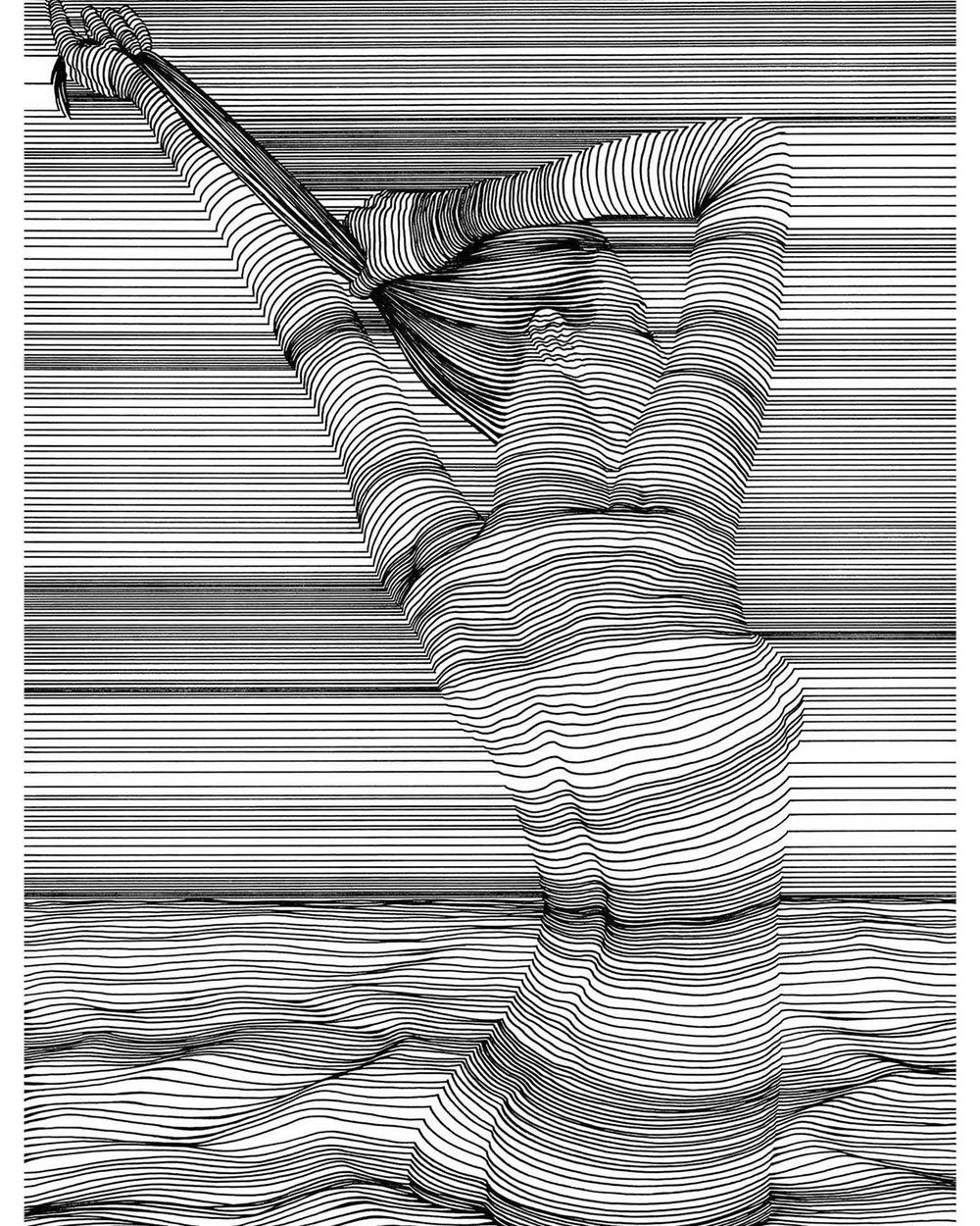 Suadenti corpi femminili, ispirati ai nudi artistici dei grandi scultori del passato, che emergono da un ordinato susseguisi di linee tracciate con un semplice pennarello nero a punta fine