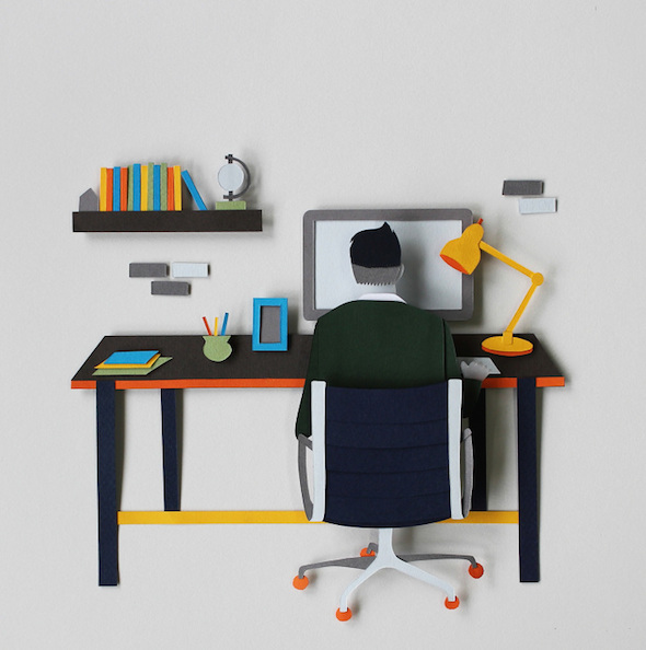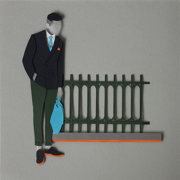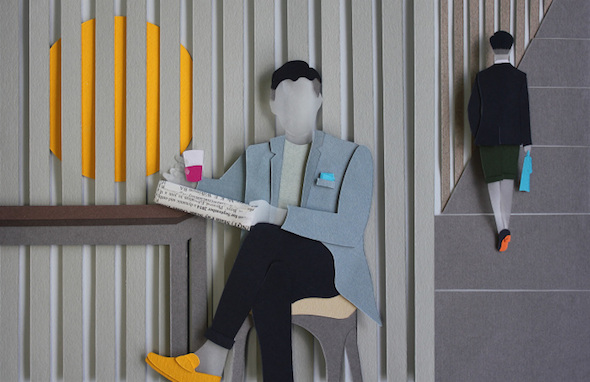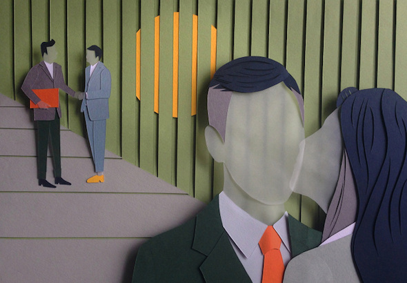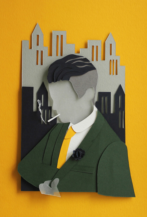 Per quanto lo stile delle illustrazioni paper-cut sia stato negli ultimi tempi abbondantemente sviluppato e a volte anche inevitabilmente copiato, Nicholas Frazier si staglia in questo panorama come un autore dal carattere altamente originale. Le sue immagini, completamente calate nella realtà lavorativa quotidiana, ritagliate dalla carta emanano un realismo al quale, così come alla routine di ogni giorno, è impossibile sfuggire. Atmosfere sixties, fuggevoli incontri metropolitani, tramonti e grattacieli dove si muovono uomini che richiamano il fascino dei Mad Men. Sembra quasi di avvertire l’odore di Martini e sigarette.
