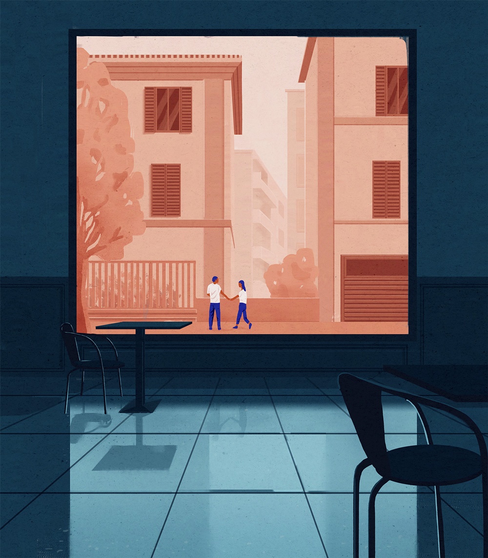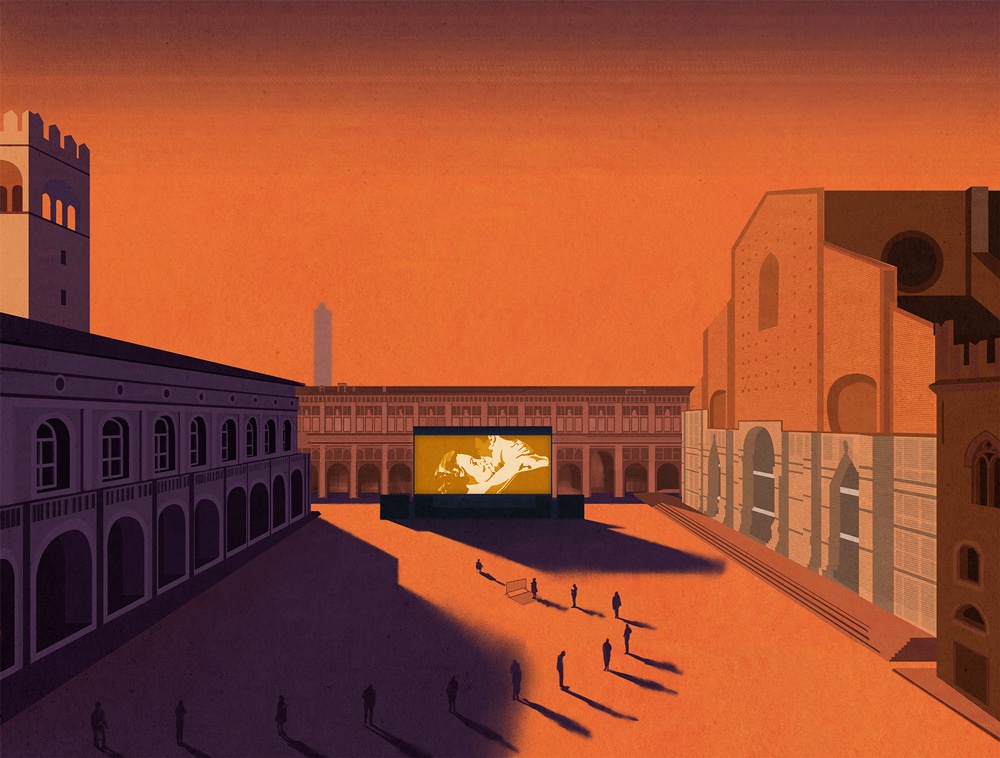 Una illustrazione a cui tengo molto è Cinema all’aperto. Vivendo a Bologna ho sempre amato “Sotto le stelle del cinema“, una rassegna durante la quale è possibile assistere a proiezioni di film in Piazza Maggiore. La piazza era sempre affollata e trovare posto non era semplice, ma era anche il suo bello. Un evento nel quale la città si riuniva per ammirare i capolavori del passato e del presente. Poi la pandemia ha cambiato tutto e improvvisamente la piazza si è svuotata.