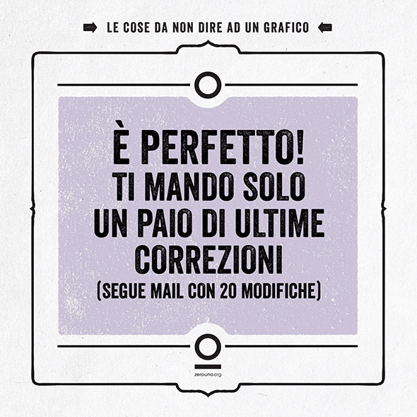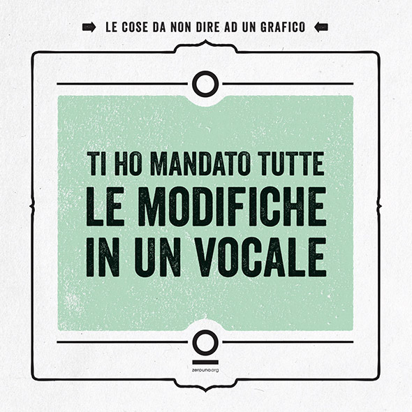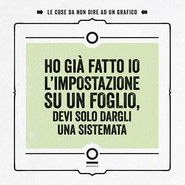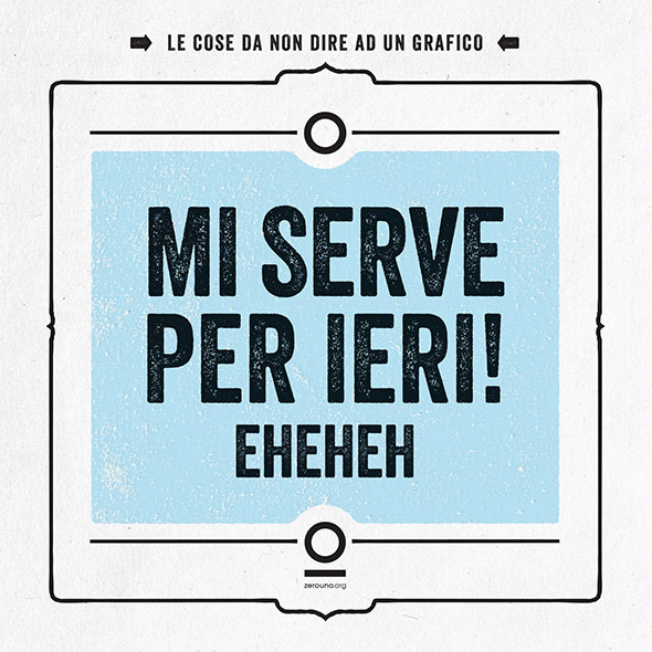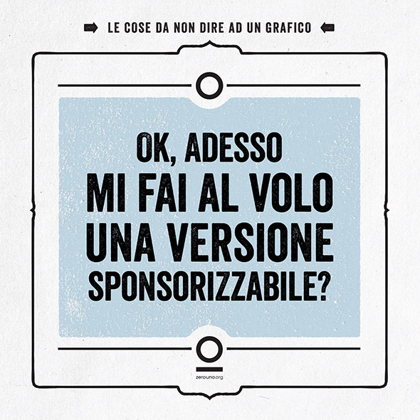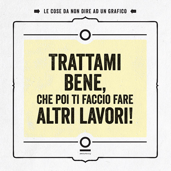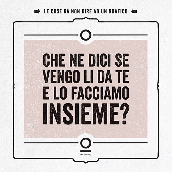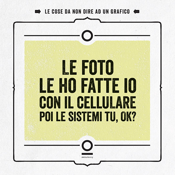 Cinque anni fa il graphic designer Luca Masini aka Zerouno decise di creare un serie che raccogliesse tutte le frasi peggiori che i grafici si sentono ripetere quotidianamente dai loro clienti. “Le 10 frasi da non dire mai a un graphic designer” in pochi giorni diventarono virali e ci spinsero ad iniziare una collaborazione con Luca creando le serie successive: “Non dirlo al Fotografo” e “Non dirlo al Designer”. Il successo di queste raccolte ha dimostrato che di creativi “frustrati” ce ne sono tanti, in tutti i settori. E che i clienti, non tutti ma parecchi, a volte riescono ad essere davvero odiosi. Bisogna però ammettere che molti di loro, i più illuminati e autoironici, si sono divertiti a leggerle, rivedendosi in alcune di esse.