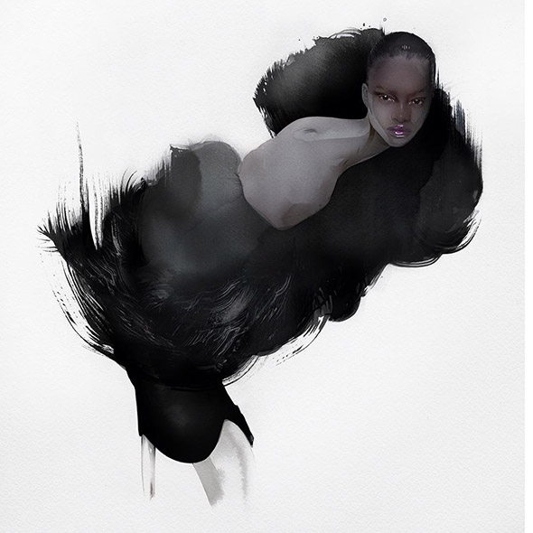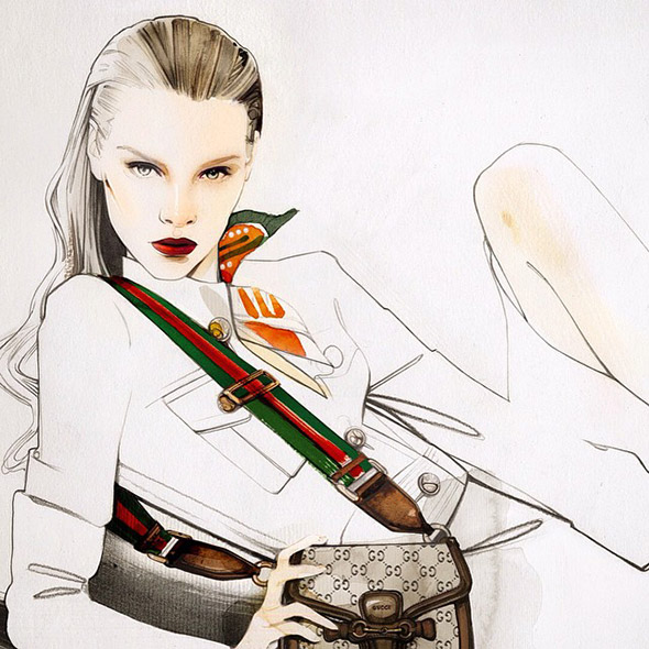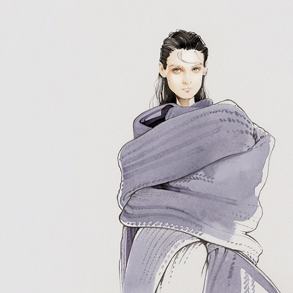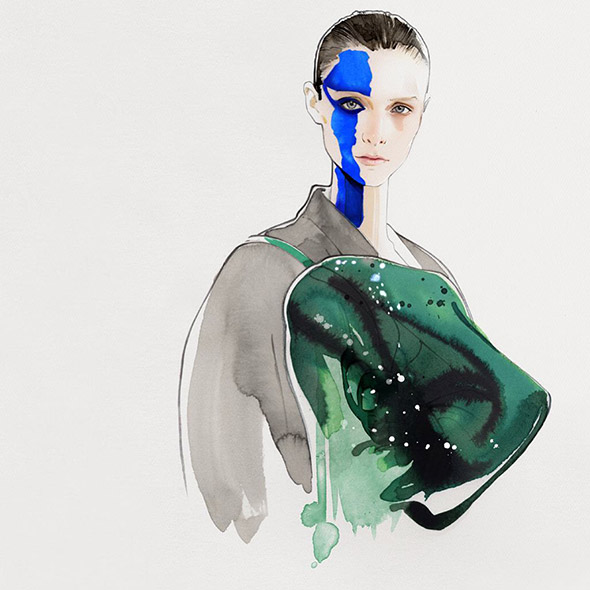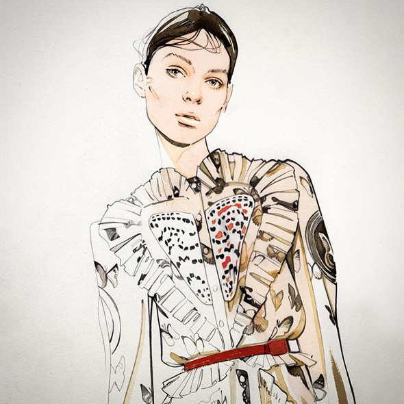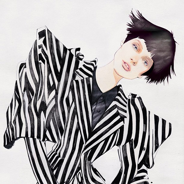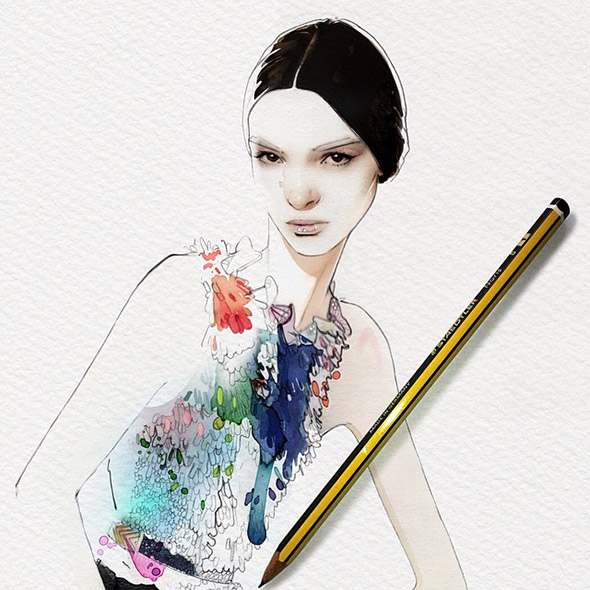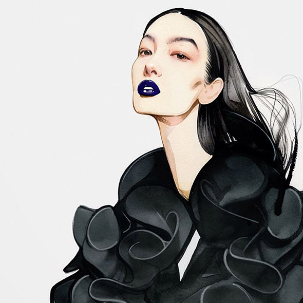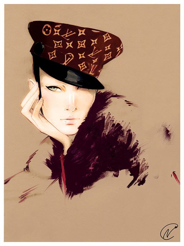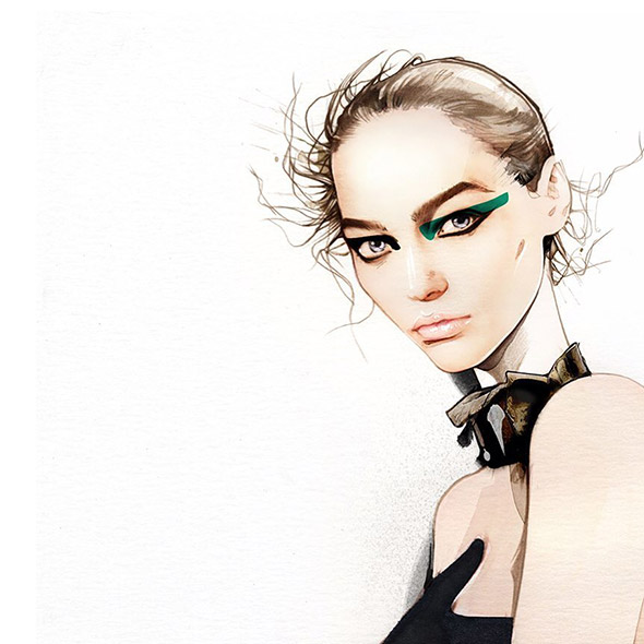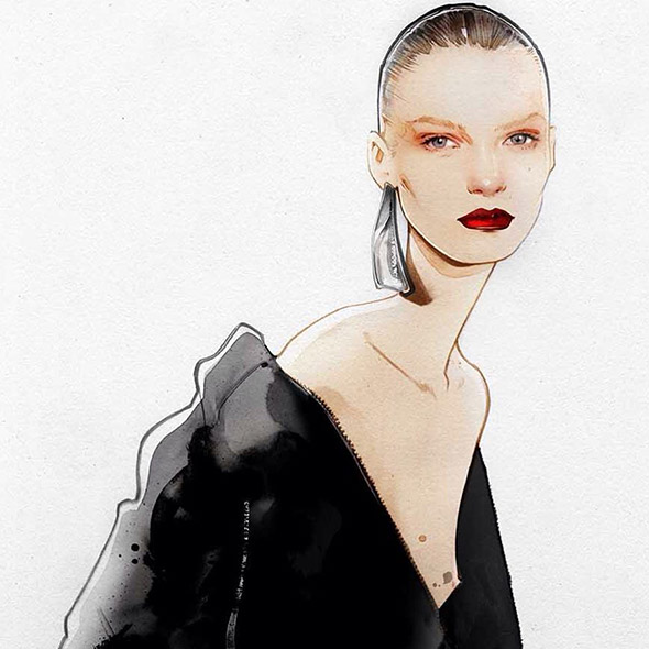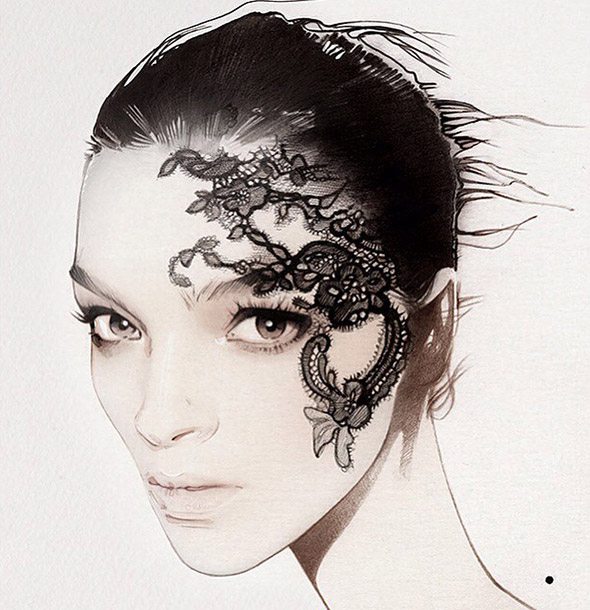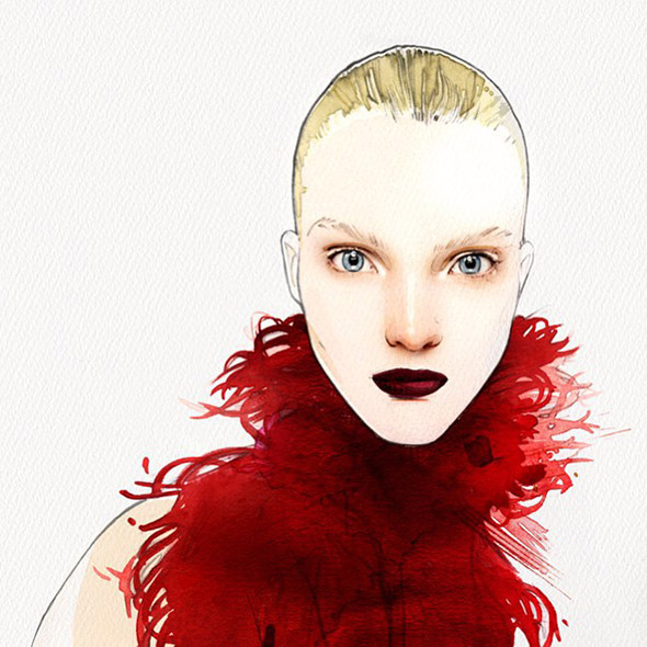 La chiave del successo va probabilmente cercata in quegli elementi in apparente contraddizione che rendono davvero unico lo stile del nostro fashion illustrator portoghese. I soggetti nel portfolio sono essenzialmente femminili e trattati con virtuosa precisione. La fedele resa dei dettagli però ad un certo punto si perde, trasformandosi in linee nette e sintetiche, quasi vettoriali: puri grafismi per suggerire silhouettes e i rimanenti tratti del volto, laddove una parte sia già stata descritta. Il risultato è di un’autenticità sconcertante. I visi escono letteralmente dal foglio, vivi e palpitanti, a riprova di una maturità artistica straordinaria. Non serve investigarne il lavoro per capire quale sia l’alchimia per cui un elemento sfuma nell’altro rimanendo in perfetto equilibrio: questo è il segreto sapientemente custodito da Nuno.