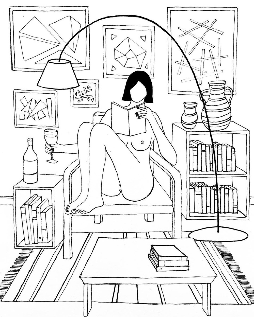 Sorseggiano amabilmente vino rosso mentre leggono o osservano il mondo esterno dalla finestra. Non indossano vestiti perchè il focolare domestico fa loro da abito e rifugio con i suoi arredi essenziali, le mensole ricolme di libri, i vasi disseminati un po’ ovunque. Il loro volto, privo di lineamenti, racchiude l’insondabilità dell’universo femminile, rappresenta il nulla e il tutto che si uniscono.