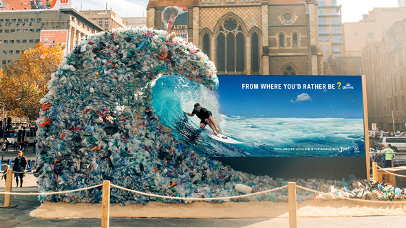 Una campagna lanciata da un famoso brand di birra in collaborazione con Parley for the oceans in diverse città del mondo in occasione del Worlds Oceans Day 2018. La scultura è realizzata con i rifiuti di plastica prodotti nella città dell’installazione. Quella che vediamo è l’intervento realizzato a Melbourne.