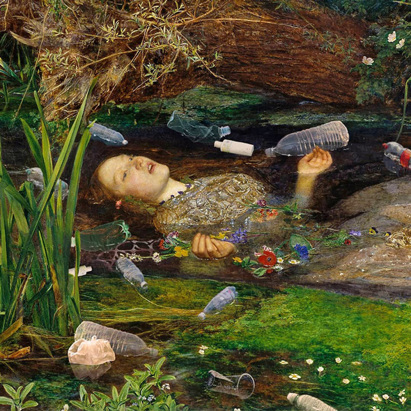Infine Raquel Aparicio ha avuto l’idea di inquinare con la plastica anche i dipinti famosi, come nel caso della famosa Ofelia del preraffaellita John Everett Millais.
